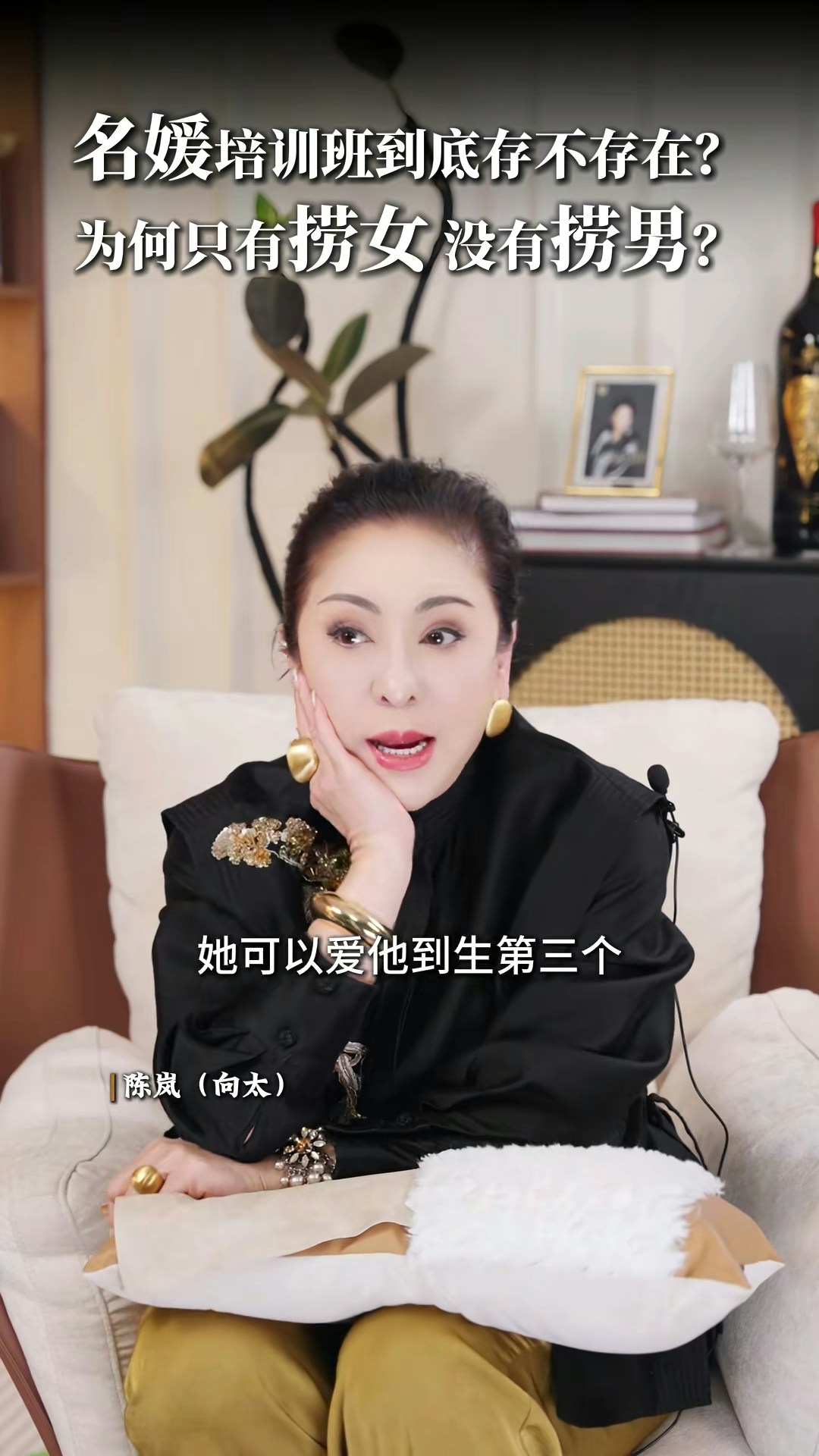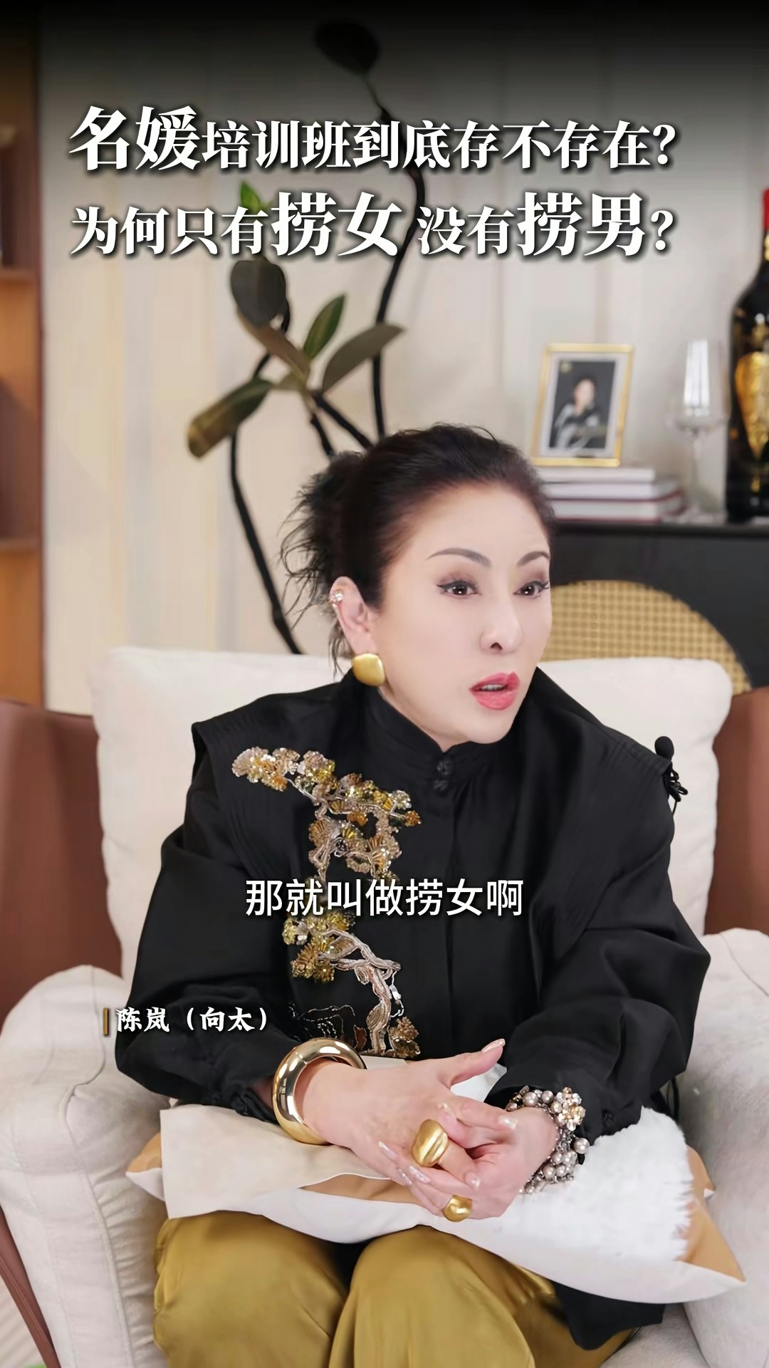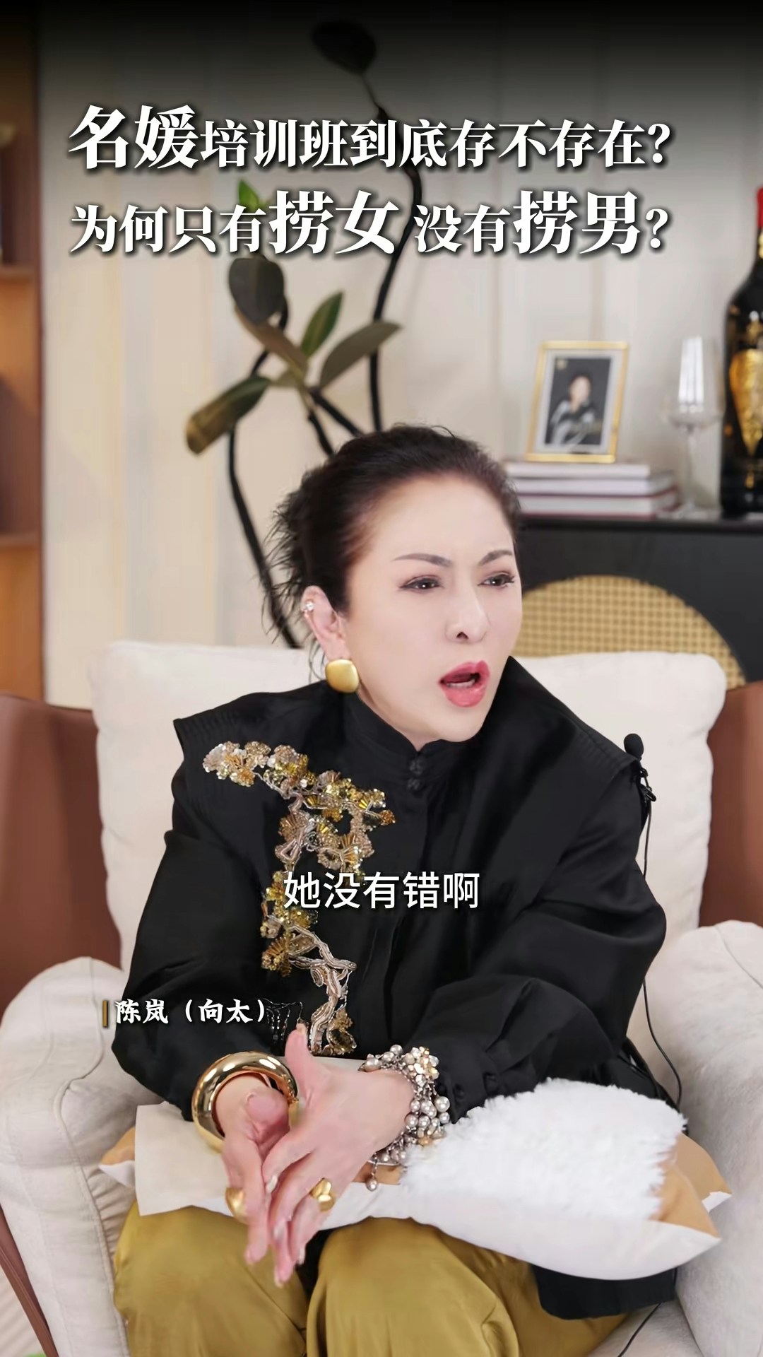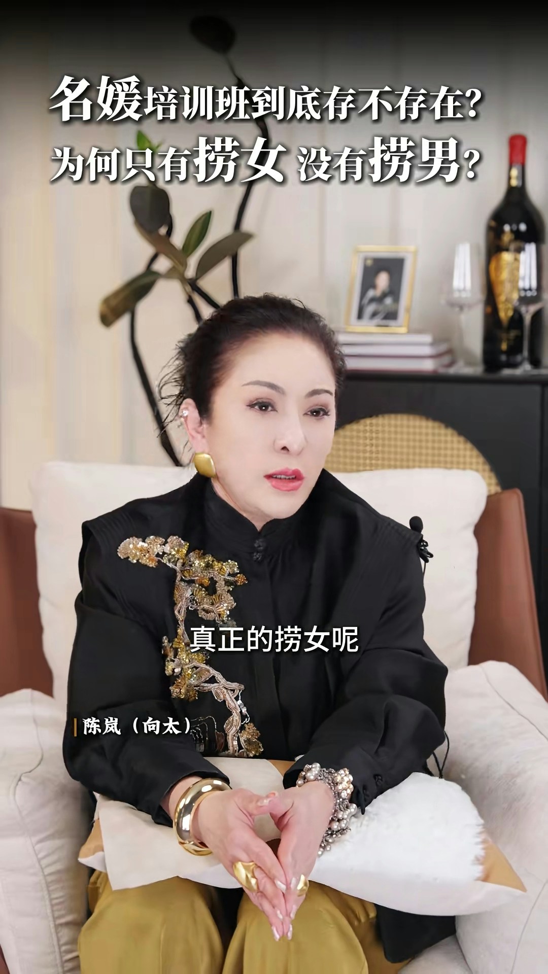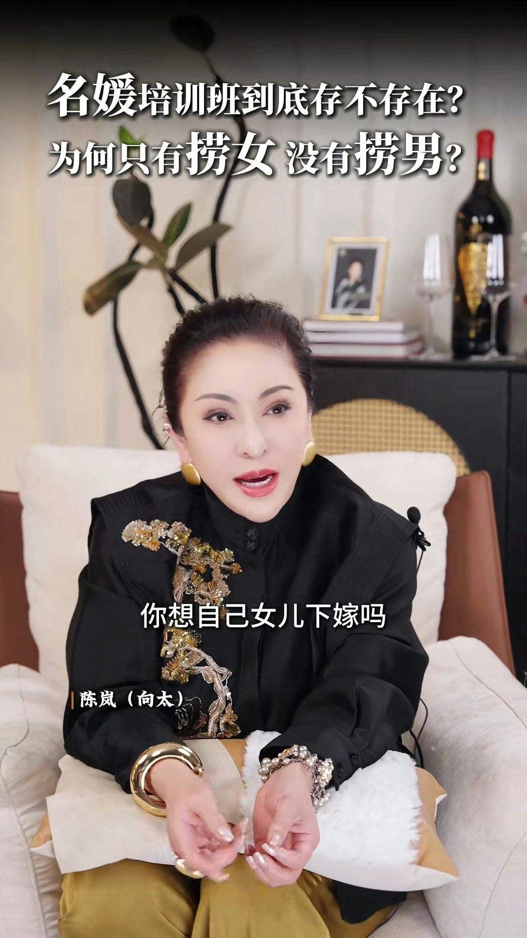 向太直言非常不喜歡「撈女」這個詞,亦否定「名媛培訓班」的存在:「現在真的叫AI教你,你不用錢對不對?培訓你,很多電子工具可以告訴你,你增值自己,其實那些禮儀你自然而然,就算你沒有真正地參與進去,你都會知道,你吃西餐應該怎麼用刀子,怎麼用叉子。」向太認為「女人上嫁」並沒有錯:「嫁個環境比自己好的,那就叫做撈女啊?神經病!如果你作為母親,你想自己女兒下嫁嗎?嫁給窮光蛋嗎?不可能的嘛。反正呢,我要是有女兒的話,我才不准學我一樣的,下嫁給一個窮光蛋!」最後她又大談對「撈女」的看法:「那種只是奔着錢去的,眼裏只有利益和算計,不顧犧牲一切道德底線的,那才是撈女。人家接觸的那種是正常的,男的追求,然後你也喜歡,成正果去結婚的那種,憑什麼叫人家撈女呢?為什麼只有撈女,沒有撈男這個詞呢?靠女人發家的那些大佬,也有很多啊,數一數!」