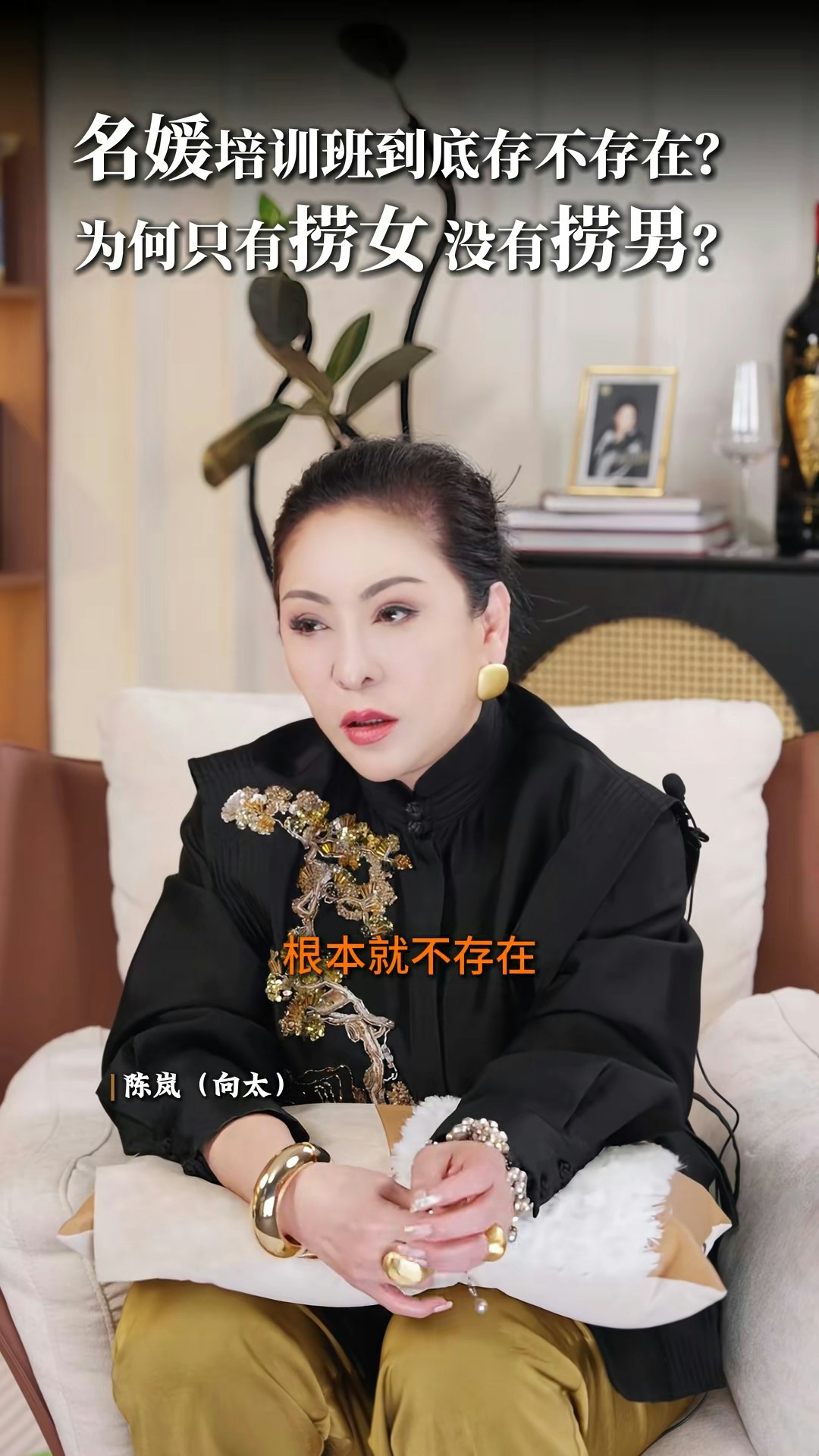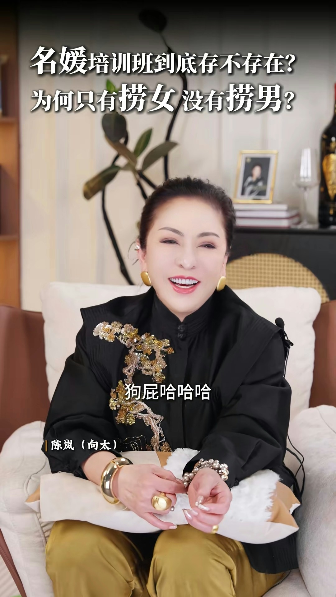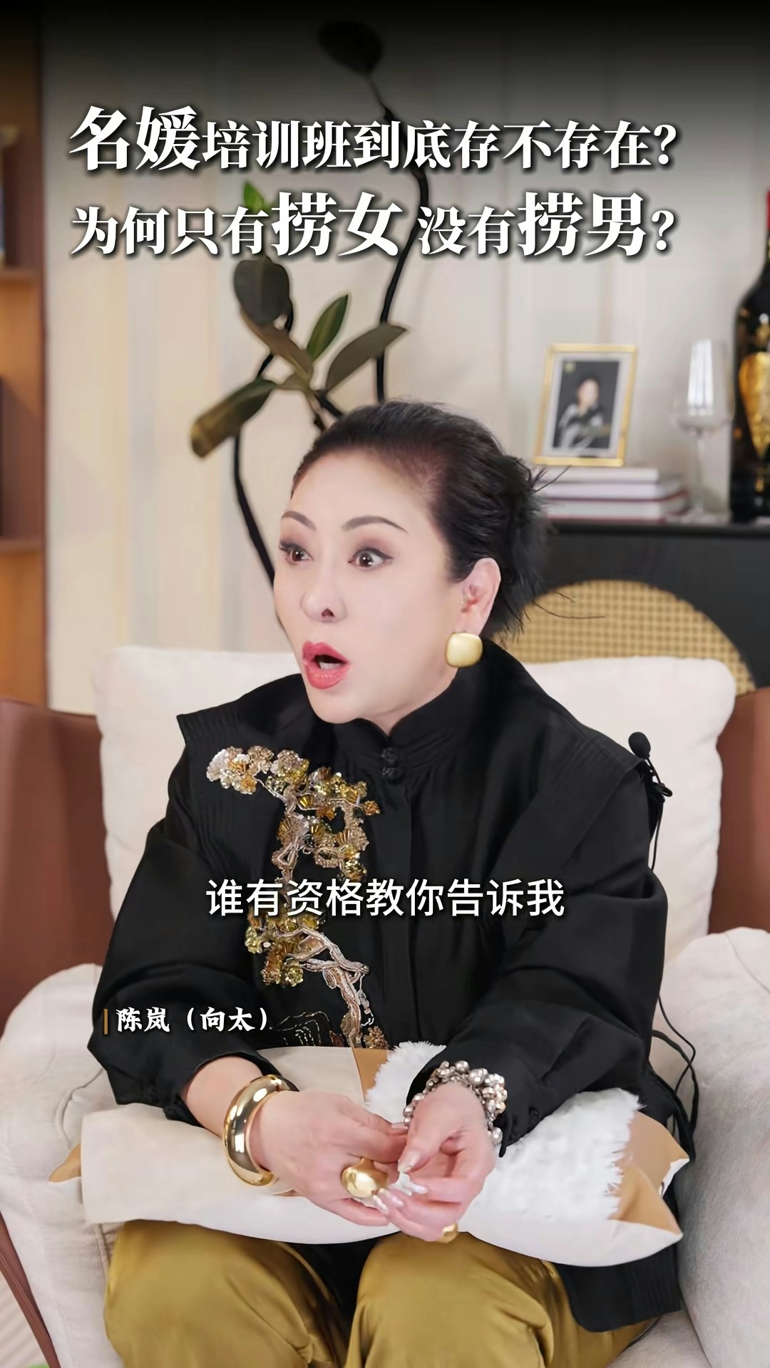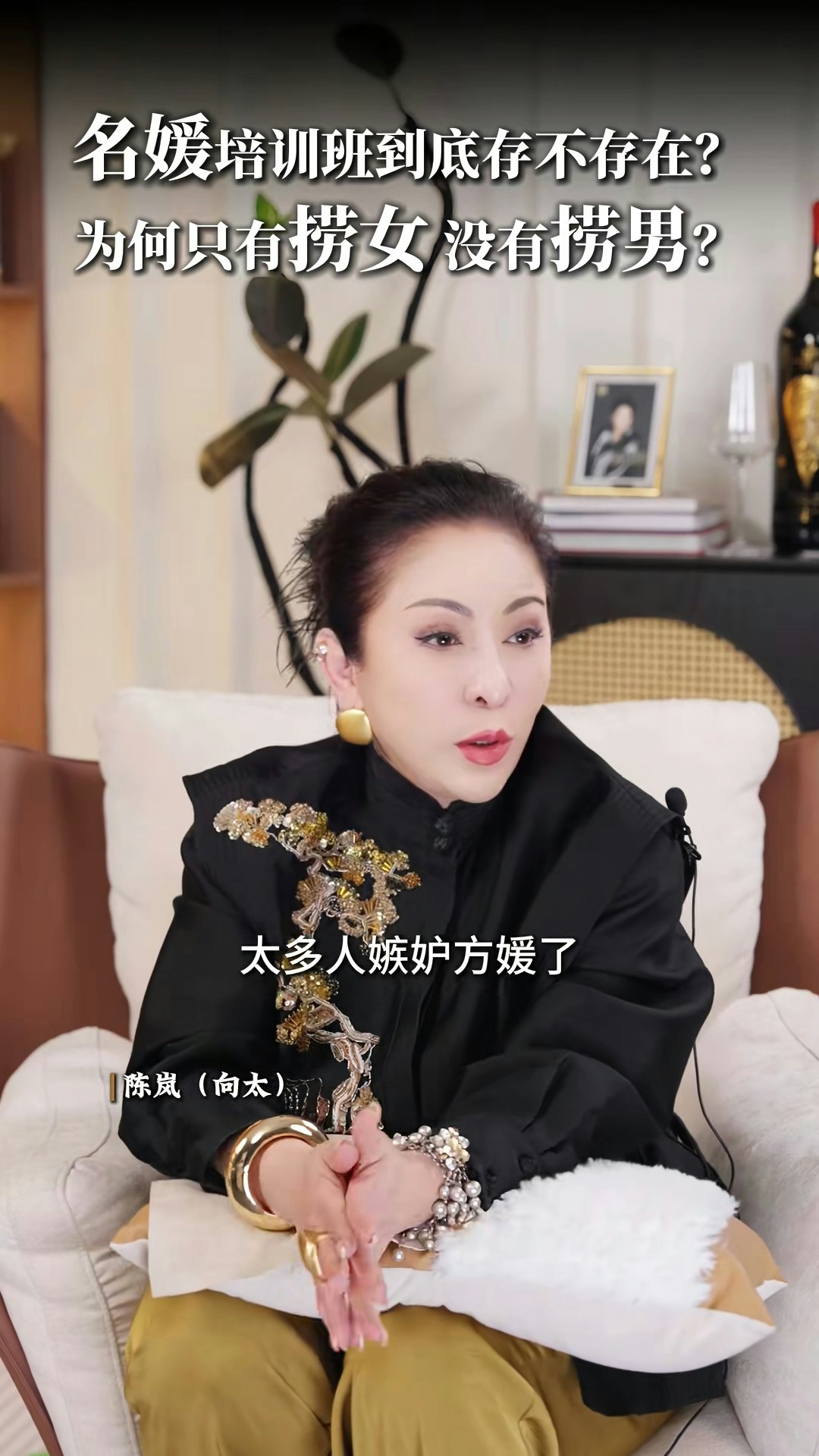 向太直言非常不喜歡「撈女」這個詞,亦否定「名媛培訓班」的存在:「現在真的叫AI教你,你不用錢對不對?培訓你,很多電子工具可以告訴你,你增值自己,其實那些禮儀你自然而然,就算你沒有真正地參與進去,你都會知道,你吃西餐應該怎麼用刀子,怎麼用叉子。」向太認為「女人上嫁」並沒有錯:「嫁個環境比自己好的,那就叫做撈女啊?神經病!如果你作為母親,你想自己女兒下嫁嗎?嫁給窮光蛋嗎?不可能的嘛。反正呢,我要是有女兒的話,我才不准學我一樣的,下嫁給一個窮光蛋!」最後她又大談對「撈女」的看法:「那種只是奔着錢去的,眼裏只有利益和算計,不顧犧牲一切道德底線的,那才是撈女。人家接觸的那種是正常的,男的追求,然後你也喜歡,成正果去結婚的那種,憑什麼叫人家撈女呢?為什麼只有撈女,沒有撈男這個詞呢?靠女人發家的那些大佬,也有很多啊,數一數!」