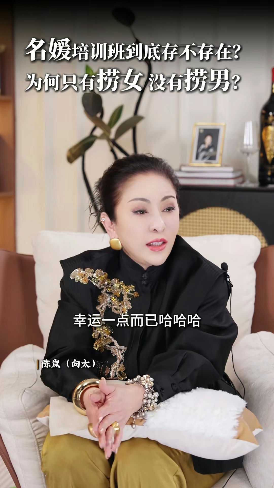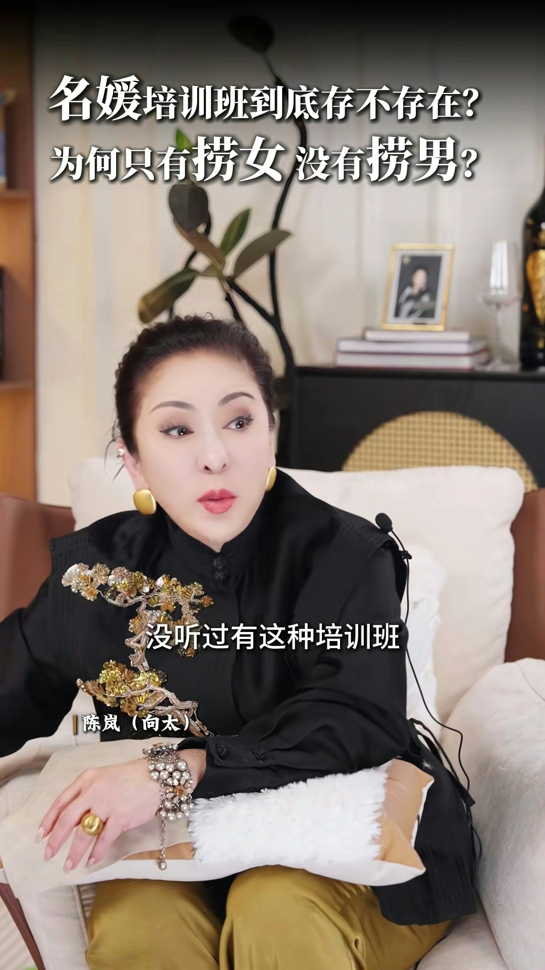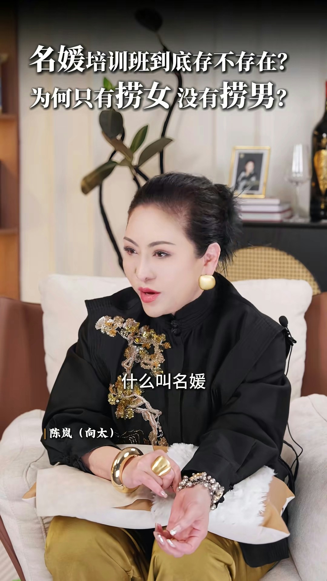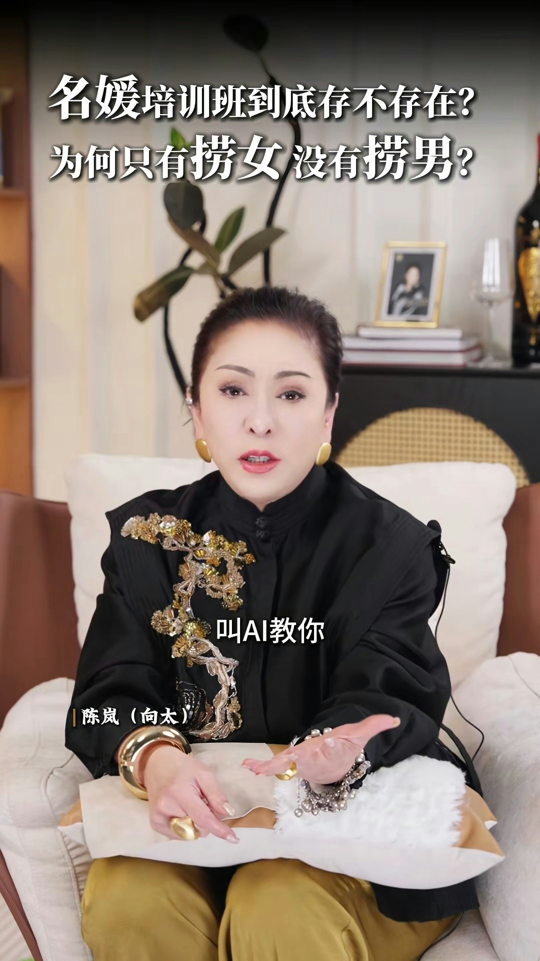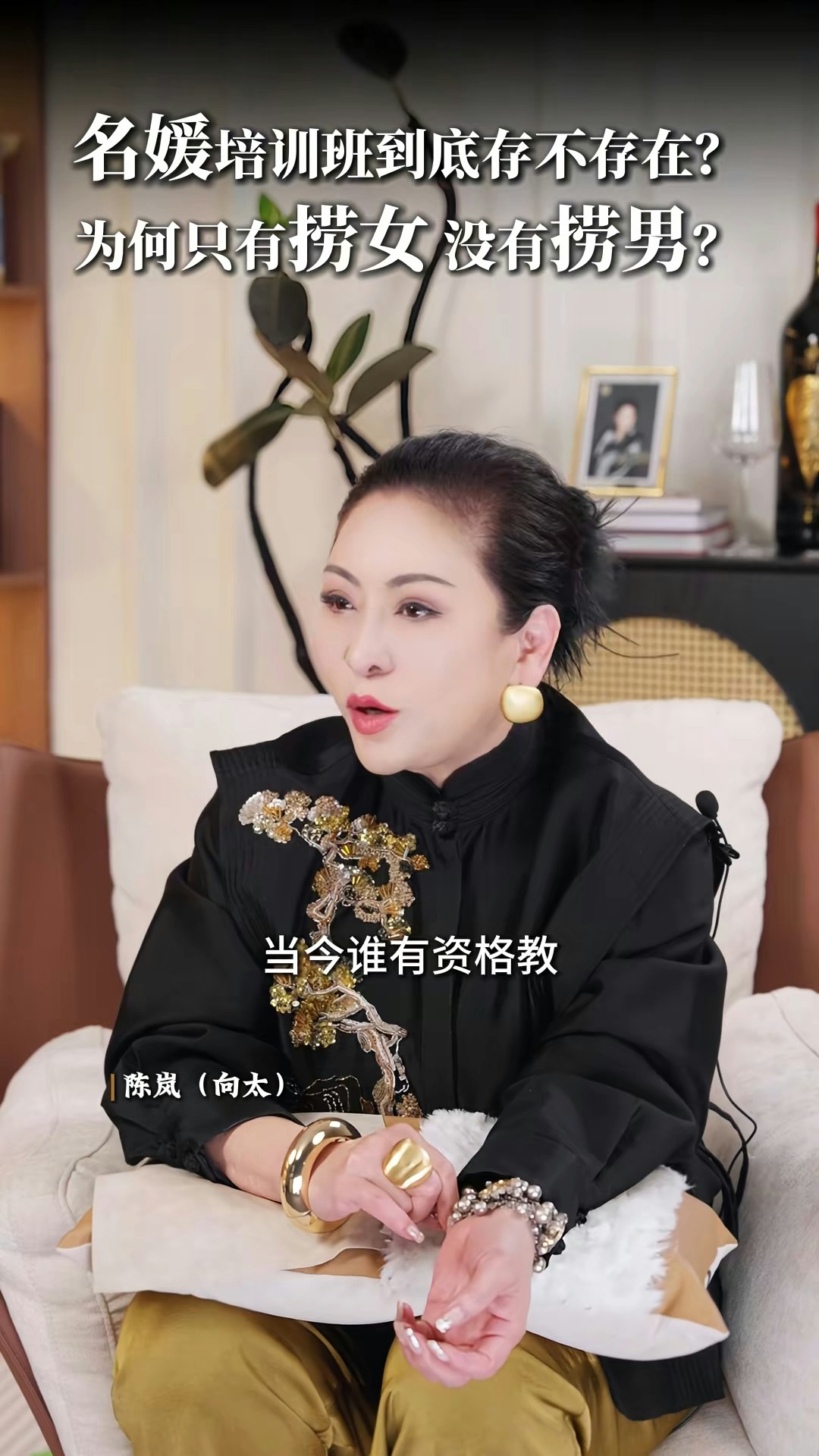 向太直言非常不喜歡「撈女」這個詞,亦否定「名媛培訓班」的存在:「現在真的叫AI教你,你不用錢對不對?培訓你,很多電子工具可以告訴你,你增值自己,其實那些禮儀你自然而然,就算你沒有真正地參與進去,你都會知道,你吃西餐應該怎麼用刀子,怎麼用叉子。」向太認為「女人上嫁」並沒有錯:「嫁個環境比自己好的,那就叫做撈女啊?神經病!如果你作為母親,你想自己女兒下嫁嗎?嫁給窮光蛋嗎?不可能的嘛。反正呢,我要是有女兒的話,我才不准學我一樣的,下嫁給一個窮光蛋!」最後她又大談對「撈女」的看法:「那種只是奔着錢去的,眼裏只有利益和算計,不顧犧牲一切道德底線的,那才是撈女。人家接觸的那種是正常的,男的追求,然後你也喜歡,成正果去結婚的那種,憑什麼叫人家撈女呢?為什麼只有撈女,沒有撈男這個詞呢?靠女人發家的那些大佬,也有很多啊,數一數!」