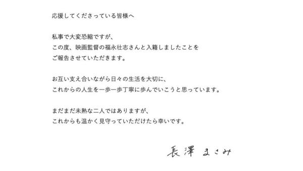 長澤雅美本人也透過書面聲明,並附上親筆署名向外界報喜。她表示「不好意思,向各位報告一見私事,我已與電影導演福永壯志先生完成結婚登記。我們將彼此扶持,珍惜每天的生活,並一步一腳印、用心走過未來的人生。我們兩人還有許多不成熟之處,但誠摯希望大家能繼續溫暖地守護我們。」
