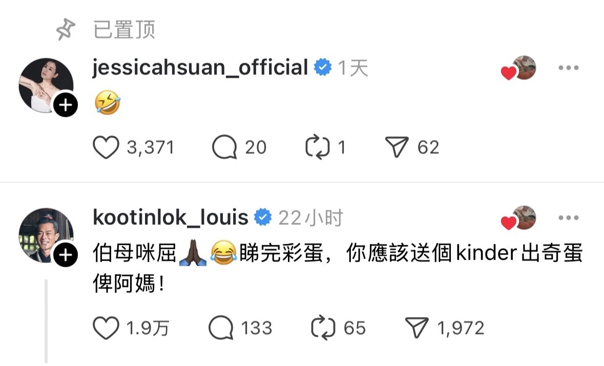 最令網民震驚的是,這則貼文竟然釣出兩位主角現身!宣萱率先留下一個「🤣」表情符號,似乎對伯母的說話感到好笑。而古天樂更親自留言,幽默地為自己「平反」:「伯母咪屈🙏 😂 睇完彩蛋,你應該送個kinder出奇蛋俾阿媽!」古仔的回應大得網民歡心,紛紛留言大讚他既風趣又親民。