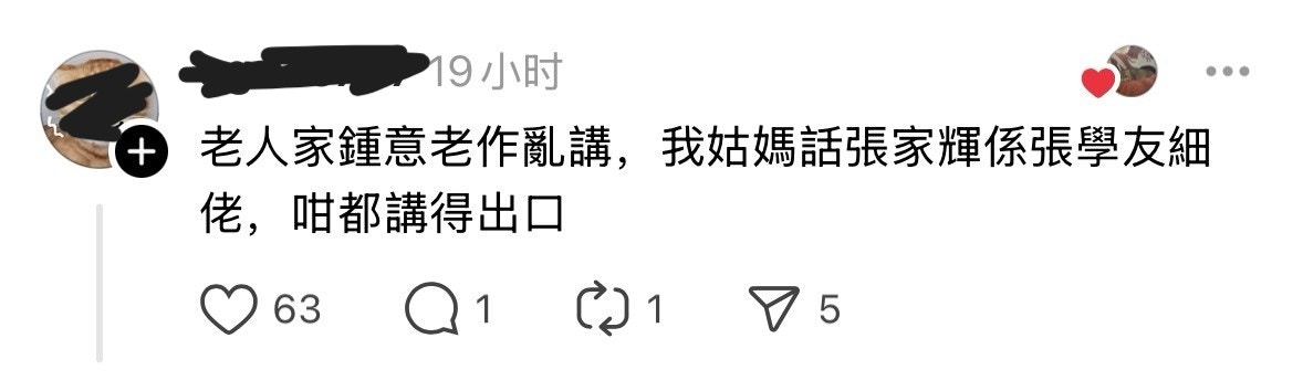 除了古宣戀情,網民亦分享了其他經典長輩傳聞,笑指老人家「鍾意老作亂講」。有人透露:「我姑媽話張家輝係張學友細佬,咁都講得出口」,令其他網民紛紛笑翻,感嘆這類演藝圈「都市傳說」在長輩界別確實非常有市場。