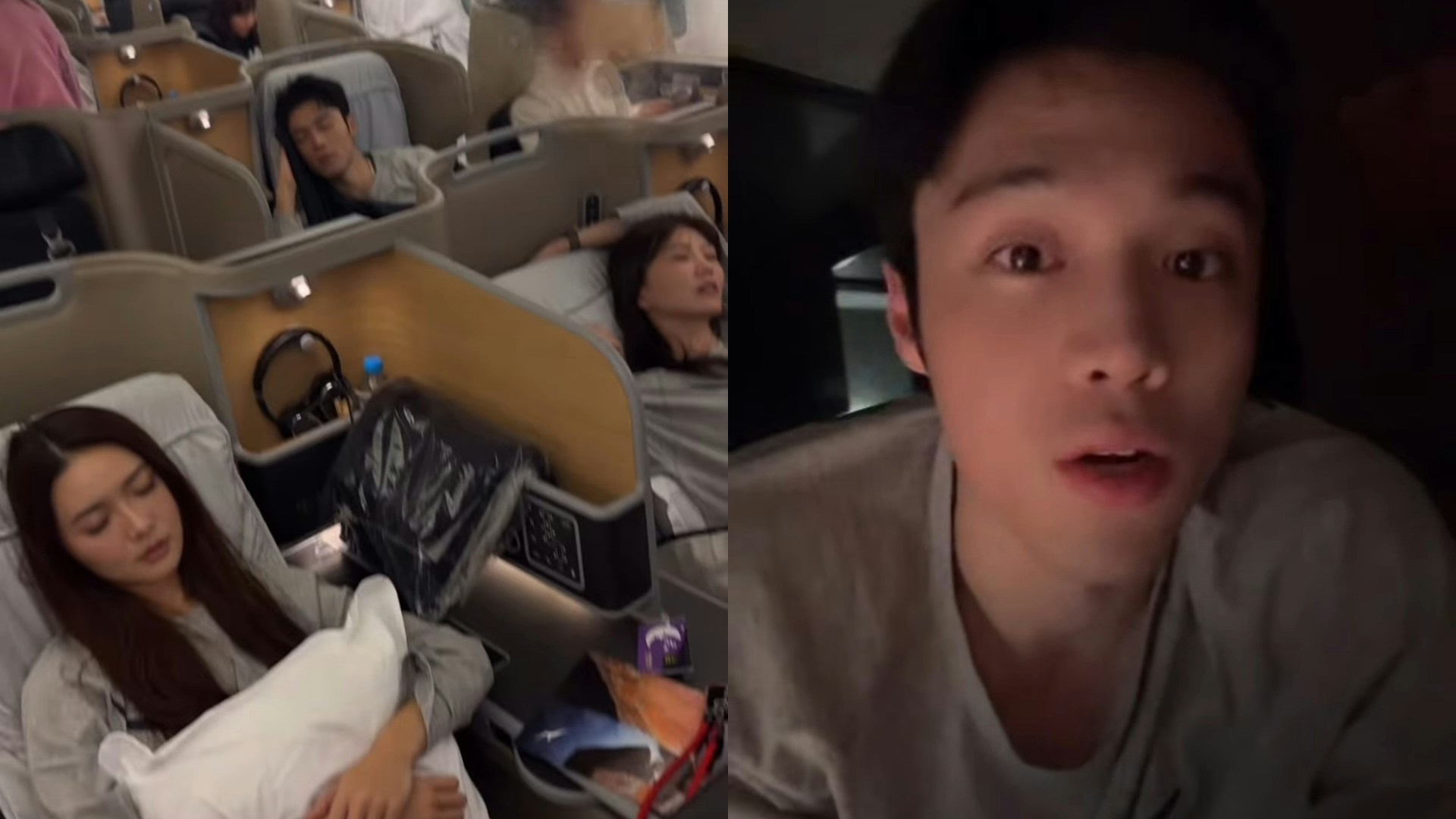 丁子朗、吳若希及戴祖儀從在飛機上的「頹爆」狀態,到於商務艙悠然入睡的畫面,笑料滿載。(ig@karl_ting)
