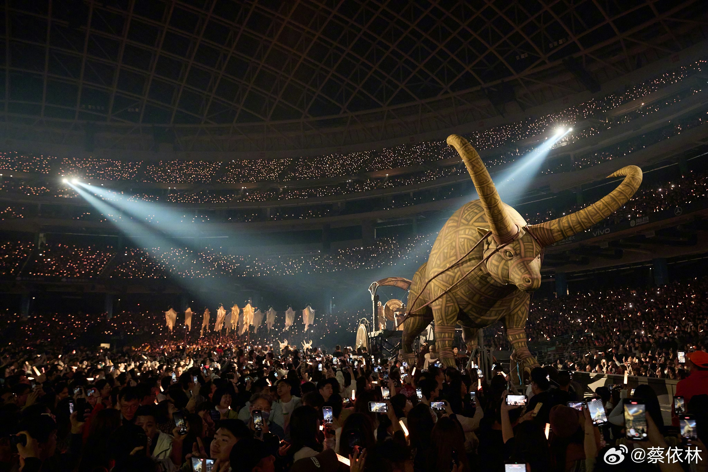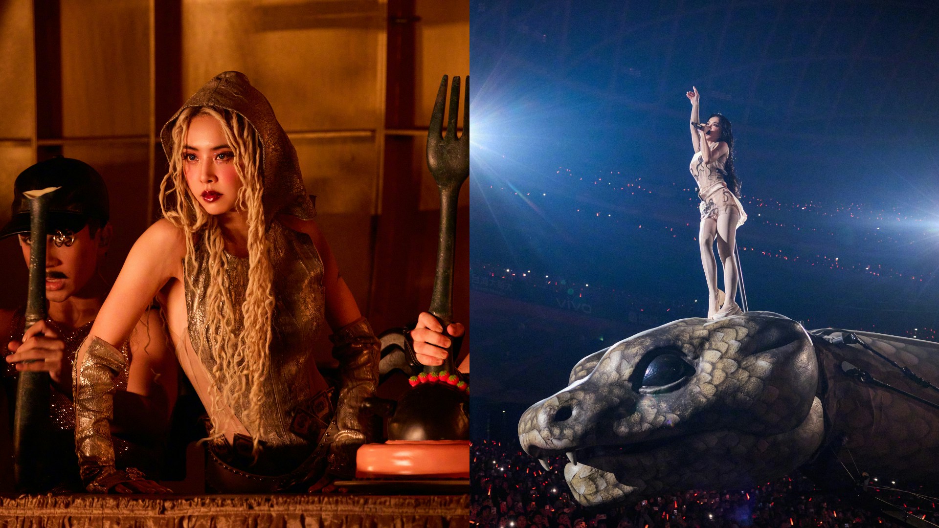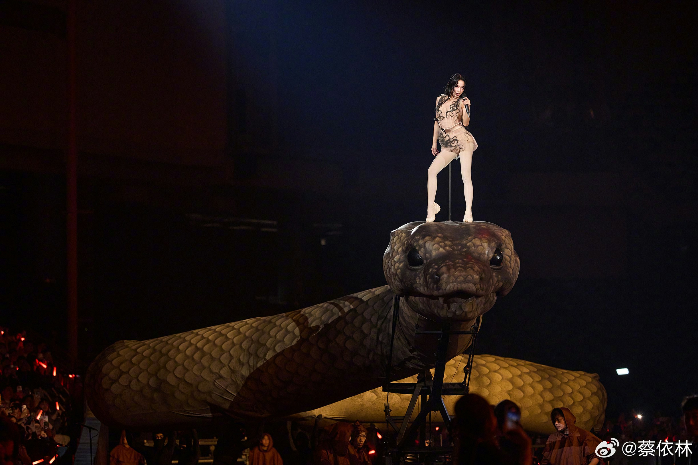 最具爭議的是舞台上一條長達30米的機械巨蛇,被網民曲解為「吸取觀眾運氣」的迷信符號。(微博@蔡依林)