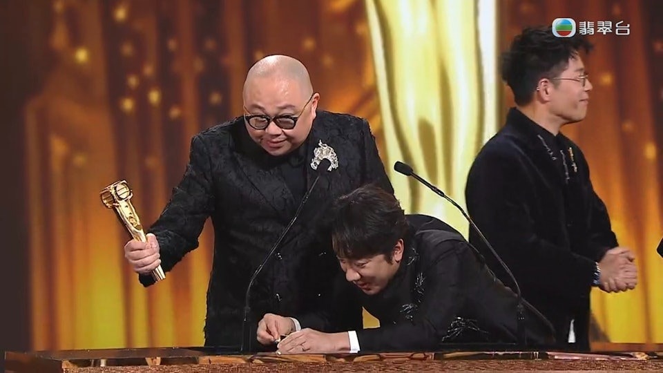 Bob首獲男最佳主持獎,因為太激動將獎座一下撞落枱時,竟將獎座打爛,令全場嚇呆!(TVB)
