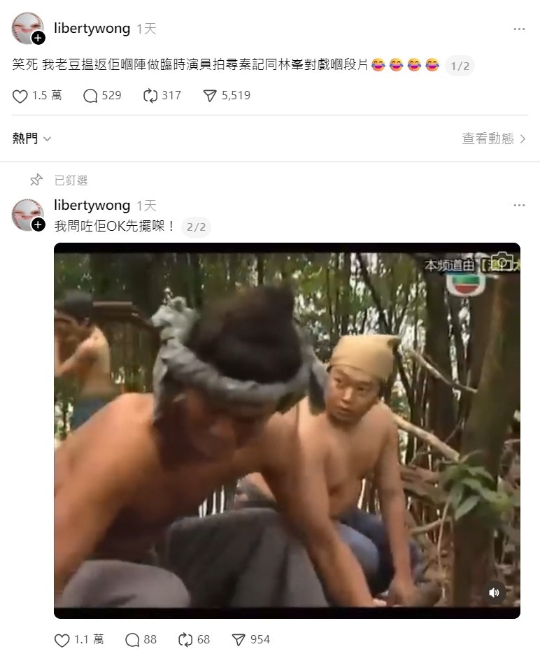 網民在Threads上載一條影片,寫上︰「笑死 我老豆揾返佢嗰陣做臨時演員拍尋秦記同林峯對戲嗰段」,一日獲1.1萬個likes。(網頁截圖)