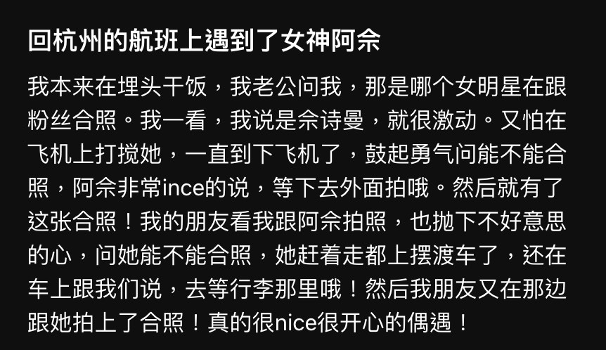 博主在社交平台分享在乘搭往杭州的飛機航班上偶遇阿佘的經歷,及二人在機艙口的合照,她寫道:「我本來在埋頭幹飯,我老公問我,那是哪個女明星在跟粉絲合照。我一看,我說是佘詩曼,就很激動。又怕在飛機上打攪她,一直到下飛機了,鼓起勇氣問能不能合照,阿佘非常nice的說,等下去外面拍哦。然後就有了這張合照!」更令人驚訝的是,當博主的朋友也想合照時,阿佘雖然已經登上了機場擺渡車(接駁車),但仍在車上更他們說:「去等行李那裡喔!」最後阿佘亦信守承諾,在領取行李處跟博主朋友合照,「真的很 nice 很開心的偶遇!」。