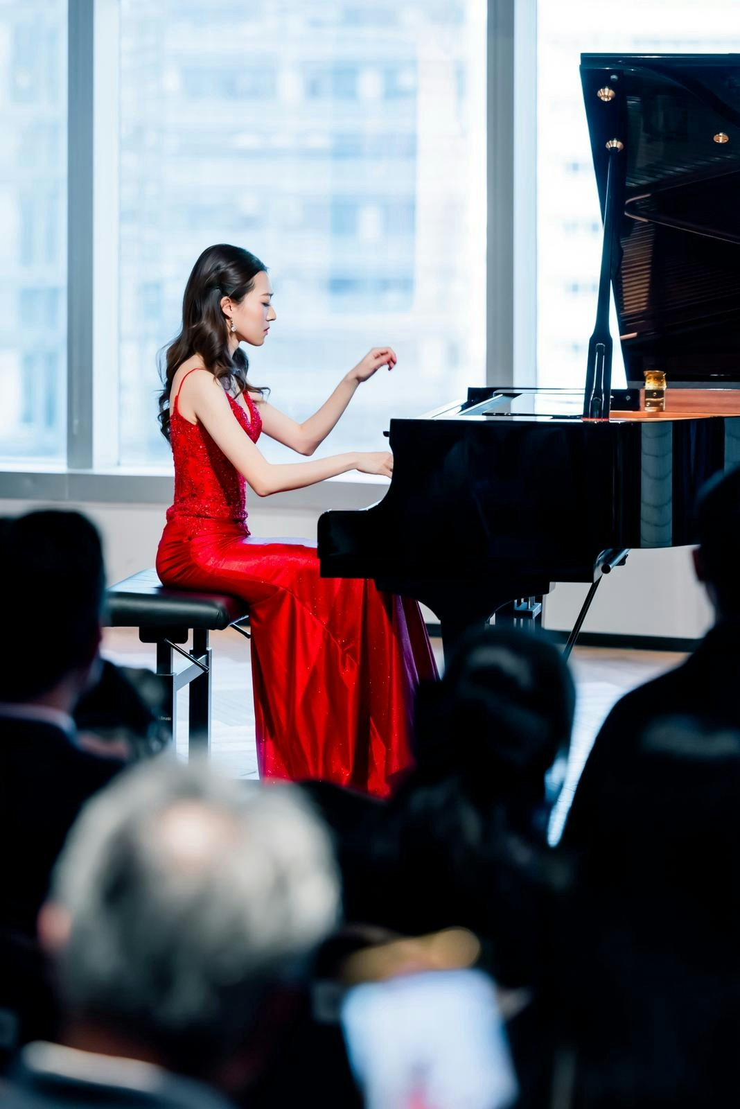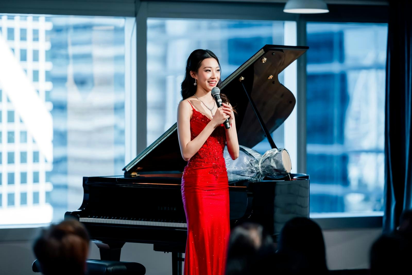 謝淑怡身穿一襲貼身紅色露肩長裙,優雅坐於黑色三角鋼琴前,背景是香港高樓大廈的落地窗景觀。 她纖細手指輕彈著琴鍵,長髮微垂,專注神情中流露自信與溫柔,讓人聯想到音樂動人時刻與情感共鳴。