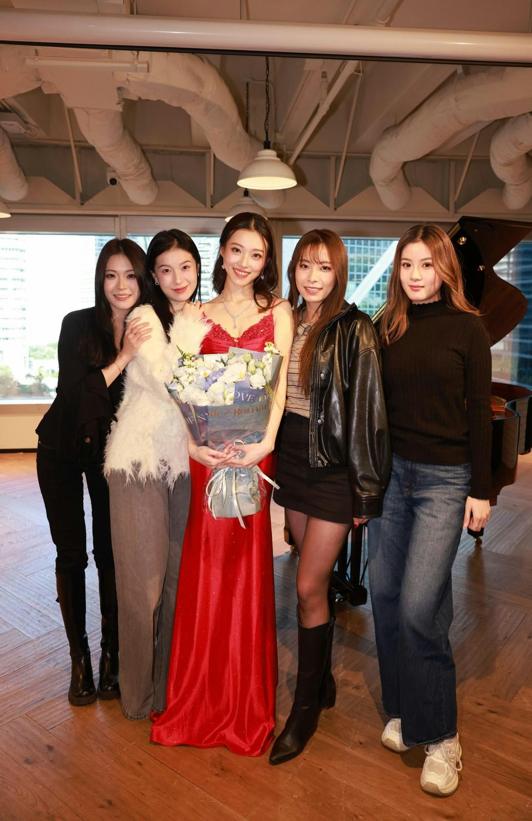 同屆港姐程姜月Dolores(左),吳芷靖Clary,俞可程Kanis(右二)和王汛文Candice緩右一)到場支持。(IG:Zoietsy)