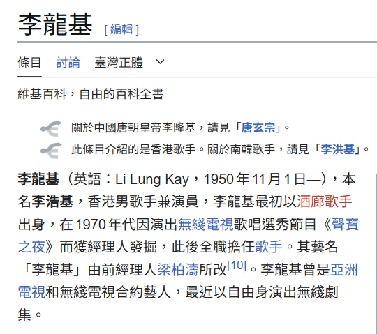 維基百科資料,李龍基原名叫「李浩基」,不過在李龍基曾接受周刊訪問時透露自己真名叫「李洪基」。(截圖)