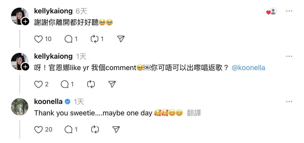有網民問官恩娜可否再出來唱歌,官恩娜未有明確拒絕,指:「maybe one day 」(Threads)