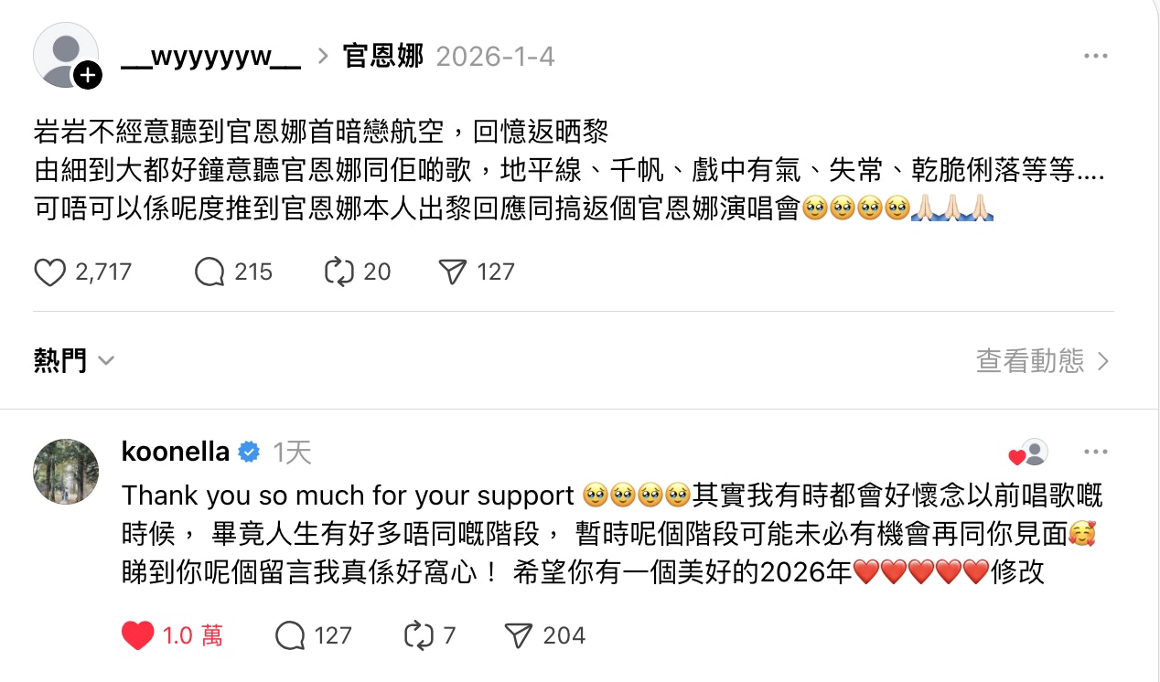 而向來在社交平台不算活躍的官恩娜,竟親自「上水」回覆透露復出意向,她說:「Thank you so much for your support. 其實我有時都會好懷念以前唱歌嘅時候,畢竟人生有好多唔同嘅階段,暫時呢個階段可能未必有機會再同你見面🥰 睇到你呢個留言我真係好窩心!希望你有一個美好的2026年❤️❤️❤️❤️❤️」大批網民留言讚官恩娜唱歌好聽又靚女,留言:「Ella 真係一粒滄海遺珠 唱歌把聲好聽 人又靚 千帆 失常 戲中有氣 依依 由他去 地平線 謝謝你離開 暗戀航空 首首都正野」、「由地平線已經開始好鍾意佢 三部曲真係好出色」、「Live 仲好聽過CD」、「我係女,但覺得Ella真係好靚好正 難得著sexy衫都覺得佢carry得好好,唔會覺得cheap, 成個畫面好靚→例如YY concert 地平線條裙,gothic 味道得嚟好靚😍😍」
