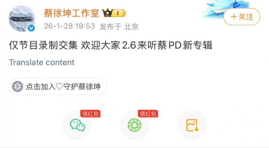 對此,蔡徐坤工作室第一時間作出回應,表示雙方僅在節目錄制中有交集,並未說明拉黑原因或就相關傳聞作出否認,同時也邀請大家在 2 月 6 日聆聽蔡 PD 的新專輯。