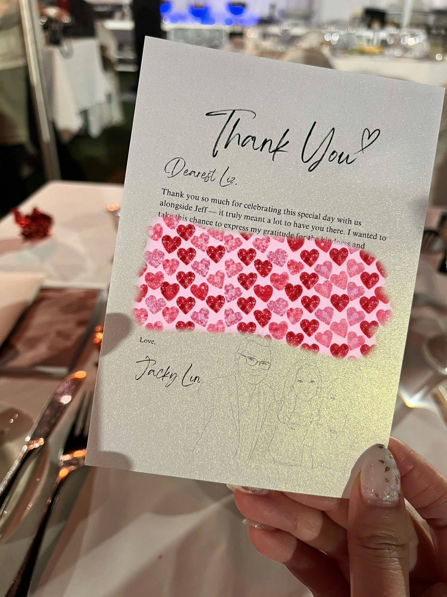 前TVB女主播金盈亦有在社交平台post出相片,她更表示原來林婷婷當日為每位賓客寫上親筆信,非常有心思。除了與林婷婷兩公婆合照之外,金盈亦post出了一些賓客的大合照,娛樂圈重量級前輩旦哥鄭丹瑞都有出席,認真驚喜!