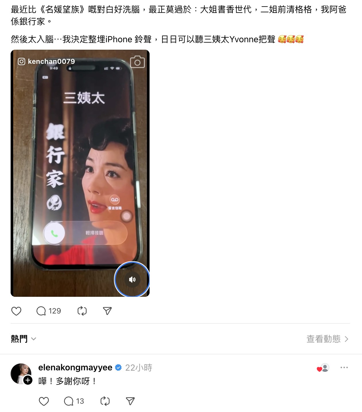 有大批網民看到帖文後,都大讚網民非常有創意,見到江美儀本尊留言,有網民即貼出江美儀的舊照,並大讚:「多謝你當年香港top3女神」、「真係好靚」。而江美儀亦搞笑回應網民:「係咪真㗎, as if I care! 😘」。另外,亦有網民大讚《名媛望族》是高質劇集:「想不斷重聽係咪正常🤣」、「我就快發夢都記得 大姐係書香世家 二姐係前清格格 我阿爸係銀行家」、「雖然感情戲內容有啲搶口 但故事其實寫得幾好 有階級鬥爭、破除封建制度」、「《名媛望族》高汁」、「世界欠江美儀同滕麗名視后!」、「呢套真係極度underrated,嗰陣睇已經覺得好好睇,每個角色都做得好好睇到人好投入」。