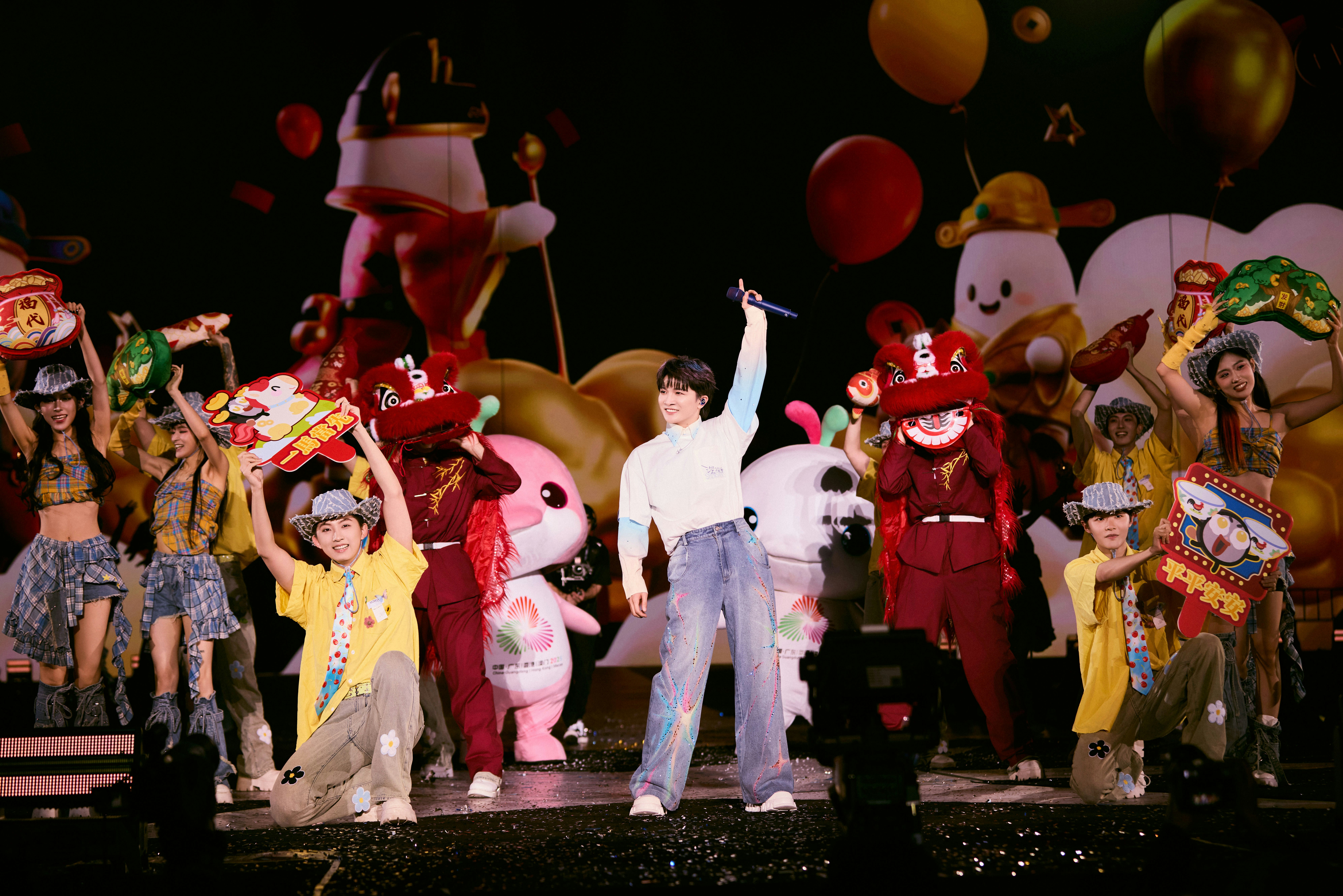 近期熱門的全運會吉祥物「大灣雞」驚喜登場,與周深共舞,令現場充滿歡樂氣氛!作為「啟德倒數第一人」,周深獻唱《小美滿》與全場觀眾倒數,更同步開啟網上直播,跟世界各地的「生米」齊齊跨年,線上有超800萬人參與觀看直播,踏入零時零分後,隨即送上經典廣東歌《財神到》,憑歌寄意向全球「生米」送上新年祝福,別出心裁!