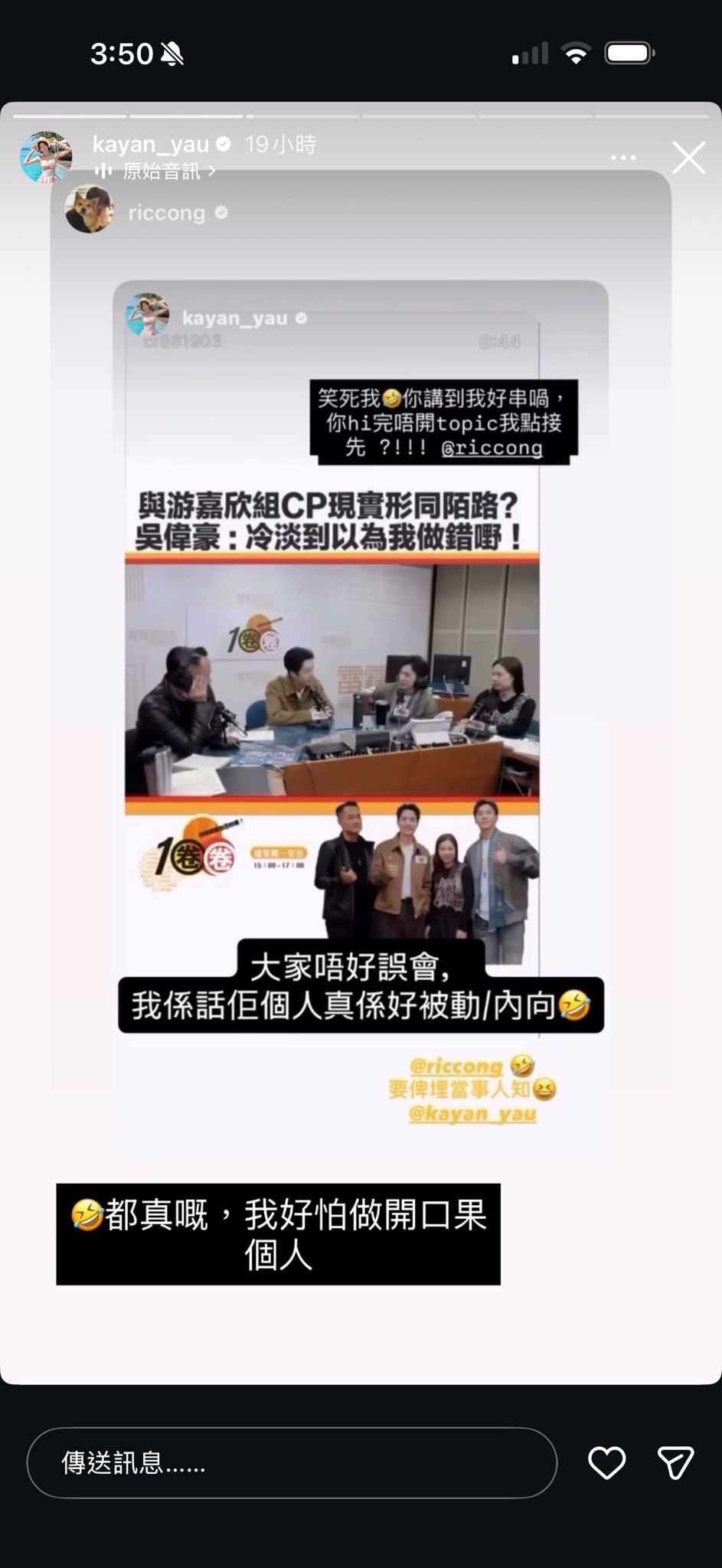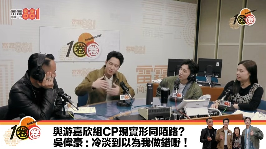 節目中,吳偉豪講道:「我覺得佢係一個非常之被動嘅人,你唔去接觸佢,佢唔會接觸你。好記得去節目巡禮,套劇已經拍完,見到佢講HI嘉欣,佢真係點下頭HI就咁。(好似唔識咁樣,合作完。)我係咪做錯咗啲咩?我哋唔係同事嚟嘅咩?」對此,游嘉欣在IG激動澄清:「笑死我,你講到我好串喎,你HI完唔開TOPIC我點接先?」