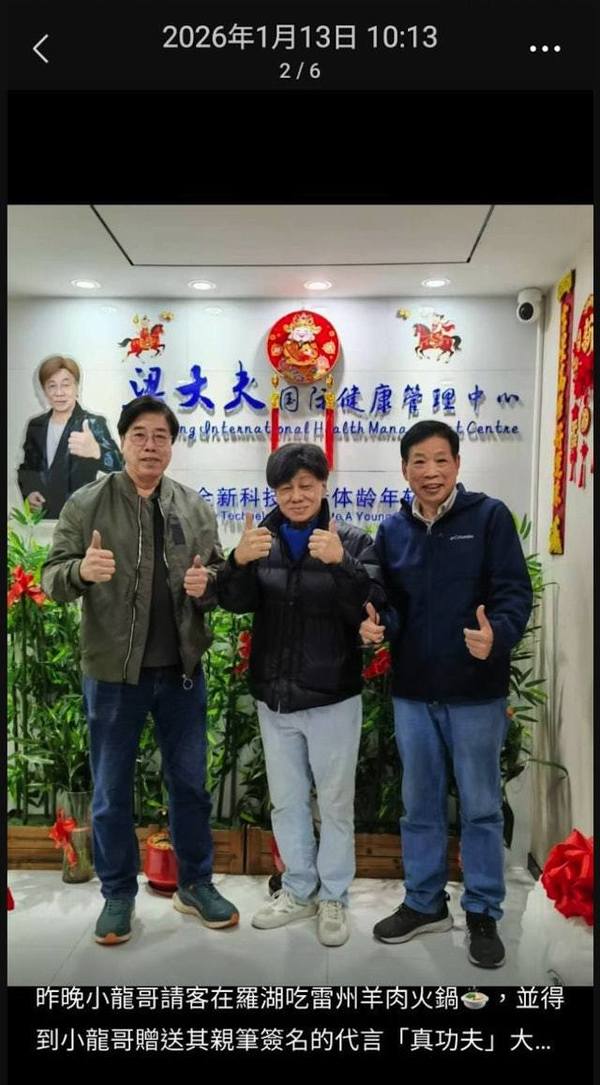 梁小龍離世消息十分突然,疑在他離世前一天(1月13日),梁小龍在深圳羅湖與友人相約食羊肉火鍋,當晚更是由梁小龍請客。從流出合照可見,照片寫著「2026年1月13日」,當晚梁小龍身穿黑色羽絨,頸上圍一條藍色圍巾。雖然略消瘦,但精神狀態看來不錯。