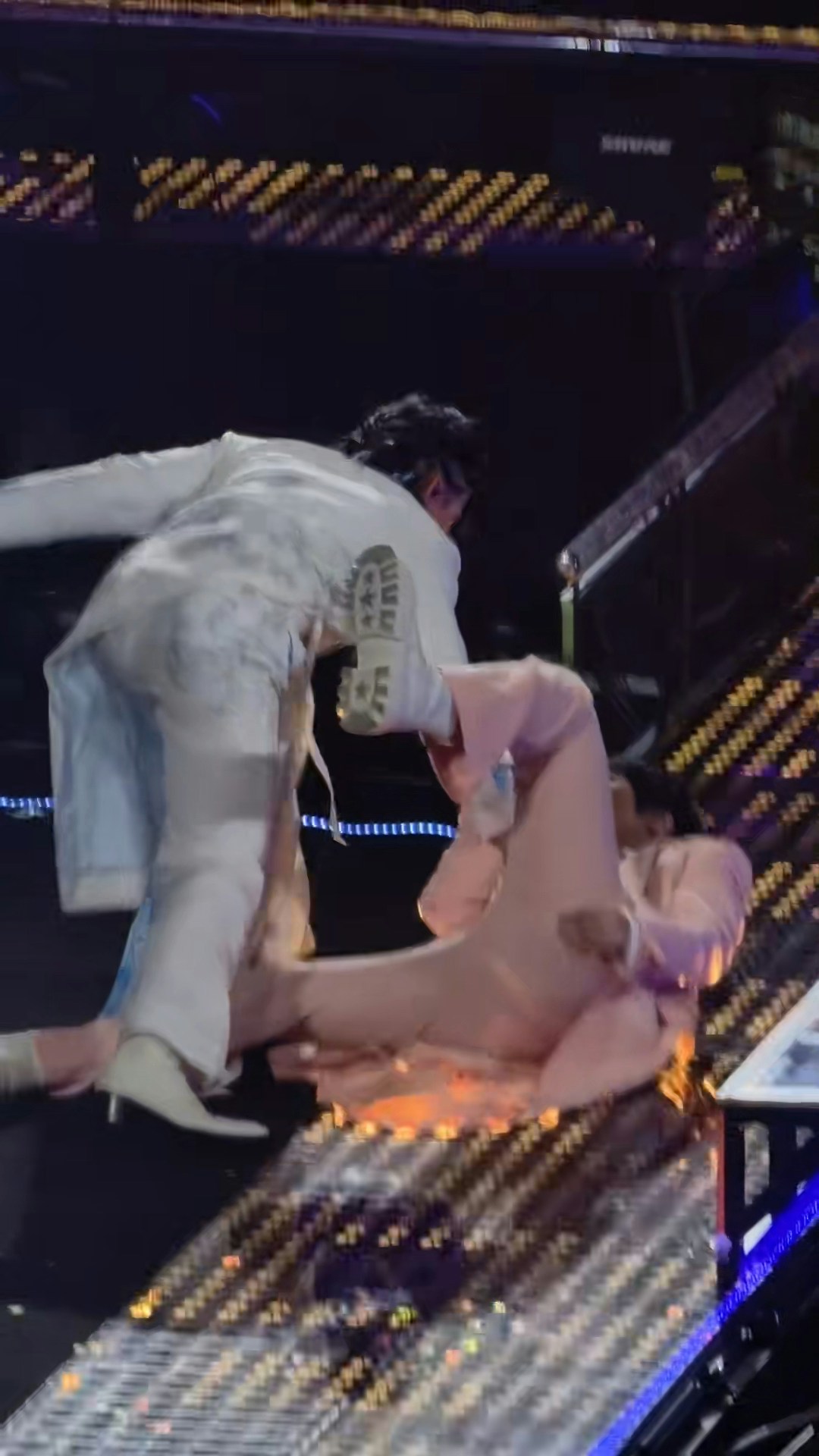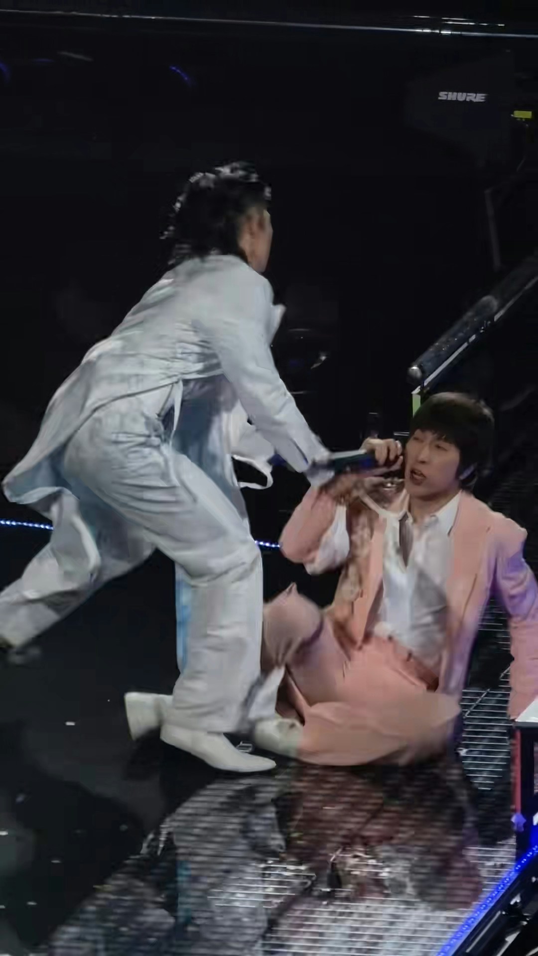 阿信在做旋轉動作時,右腳不慎勾到吳建豪西裝的下擺,導致失重心向後摔。(小紅書圖片)