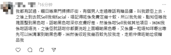 帖文引起網民熱議,不少人表示都遇到過類似的「死纏」推銷套路,並呼籲大家小心,「陌生人唔好理」、「之前返去東門玩一下,點知行幾步即刻有兩個男嘅衝過嚟幫你抹鞋勁得人驚」、「咁恐怖?」。