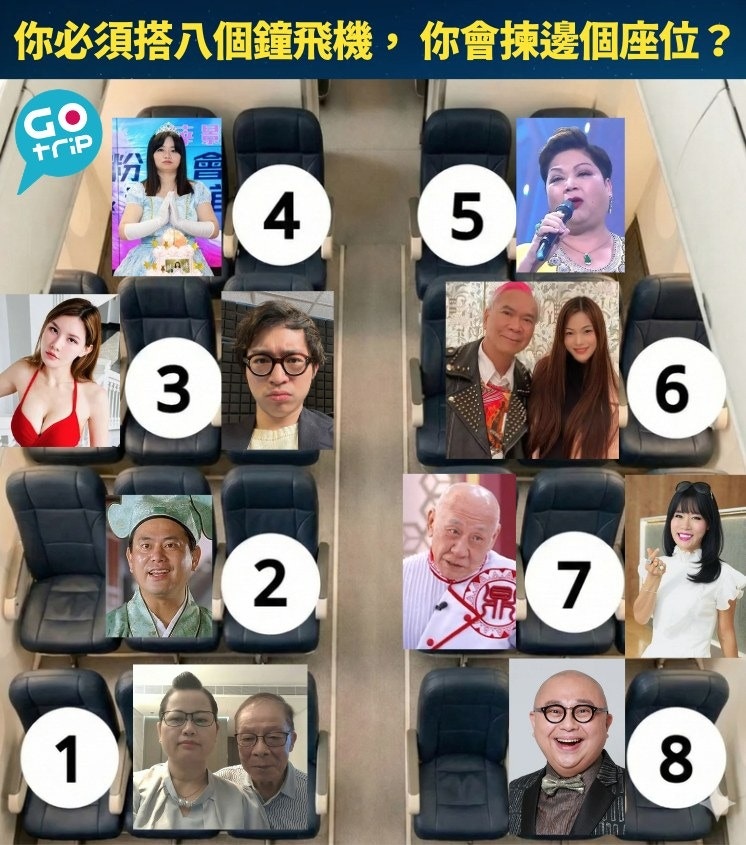 這張被網民戲稱為「地獄航班」的座位表,列出了8組極具話題性甚至爭議性的人物供選擇。名單陣容相當「豪華」且驚人,包括:全城熱話的何伯何太、出名牙擦的陳百祥(阿叻)、「抽水王」林作及其五位女伴、亞視一姐薛影儀(阿儀)、聲大大見稱的肥媽、早前是非纏身的李龍基與未婚妻王青霞、以及教煮餸的鼎爺夥拍七師傅。最後一個選項,則是林盛斌Bob。