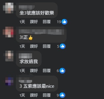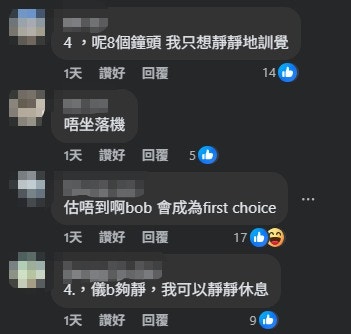 不過,在「絕望」中仍有少數網民另闢蹊徑。有人選擇3號林作與裕美(五索),認為過程「應該好歡樂、好多花生食」;亦有人選擇4號阿儀,理由相當實際:「佢夠靜,我可以靜靜地休息,唔會煩我」;甚至有人為了美食選擇7號:「坐鼎爺隔離可以學煮餸」。整體而言,網民普遍認為這是一條「送命題」,Bob已是當中的「安全牌」。