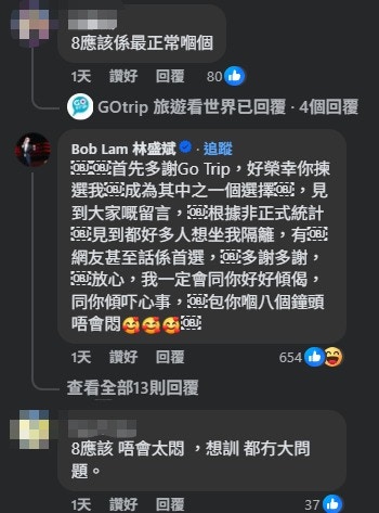 對於意外由「最討厭」變成「最受歡迎」,Bob本人亦感到相當驚喜,更親自「落場」在貼文下留言謝票。他發揮其一貫的幽默感與親和力,回覆道:「好榮幸你揀選我成為其中之一個選擇……多謝多謝,放心,我一定會同你好好傾偈,同你傾吓心事,包你嗰八個鐘頭唔會悶。」