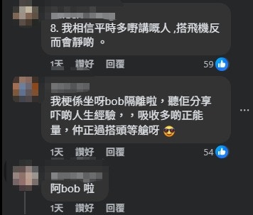 這番大方得體的回應進一步贏得網民歡心,有人笑指這簡直是免費聽了8小時Talk Show,賺到了;亦有網民搞笑表示,有Bob這位「大佬」坐在旁邊,感覺特別踏實,「個心都定啲」,甚至打趣指「叫空姐攞杯麵都快過撳鐘」。這次意外的人氣逆轉,無疑為Bob進行了一次成功的「洗底」。由昔日的「最討厭」變成今日的「飛機友首選」,證明了只要對手夠「強勁」,負評王也能隨時逆轉勝。
