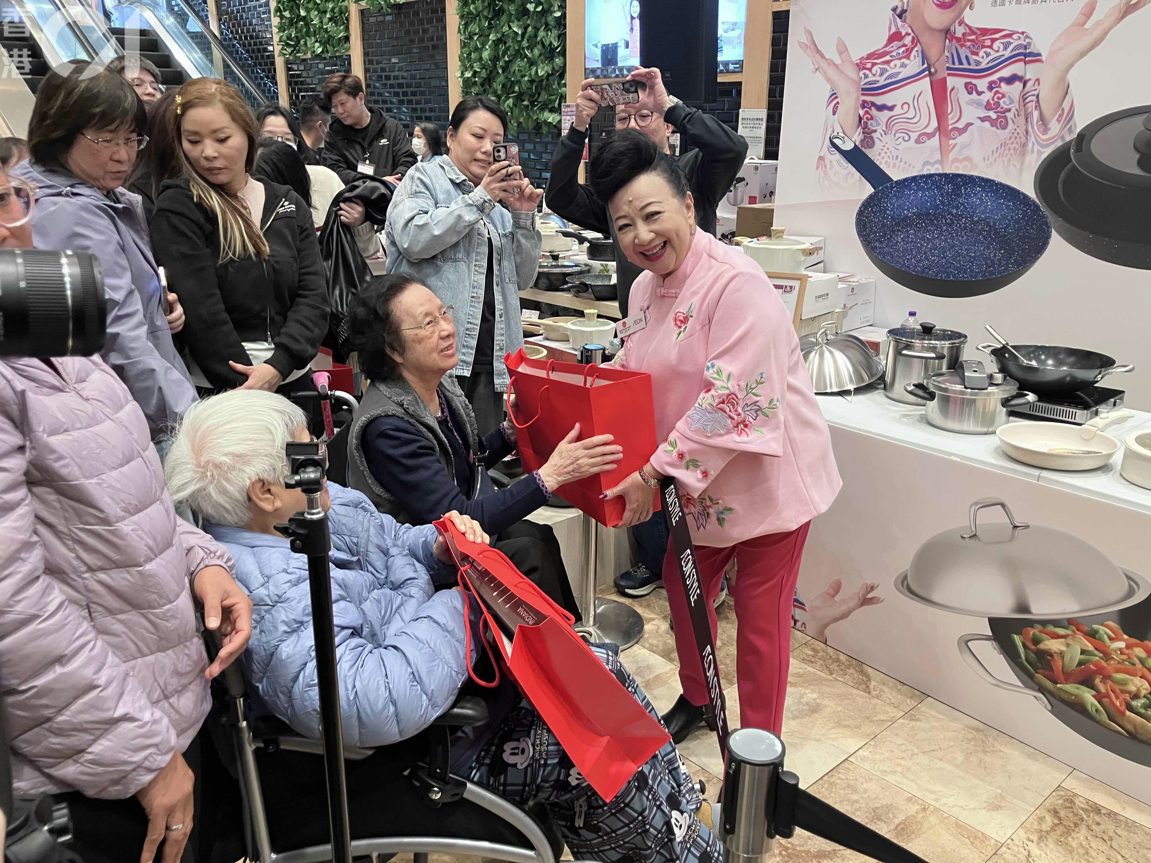 家燕姐送福袋給現場長者。(林迅景 攝)