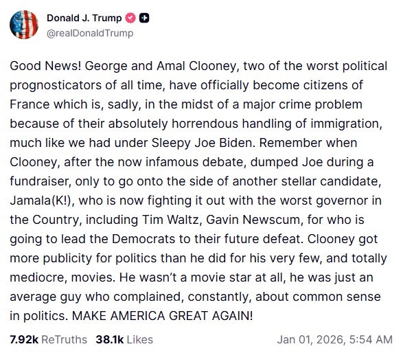 特朗普續稱「佐治古尼在政治方面比他那寥寥數部平庸的電影更受人關注。他根本算不上什麼電影明星,只是個平傭的人,總是抱怨,抱怨政治常識。讓美國再次偉大吧!」