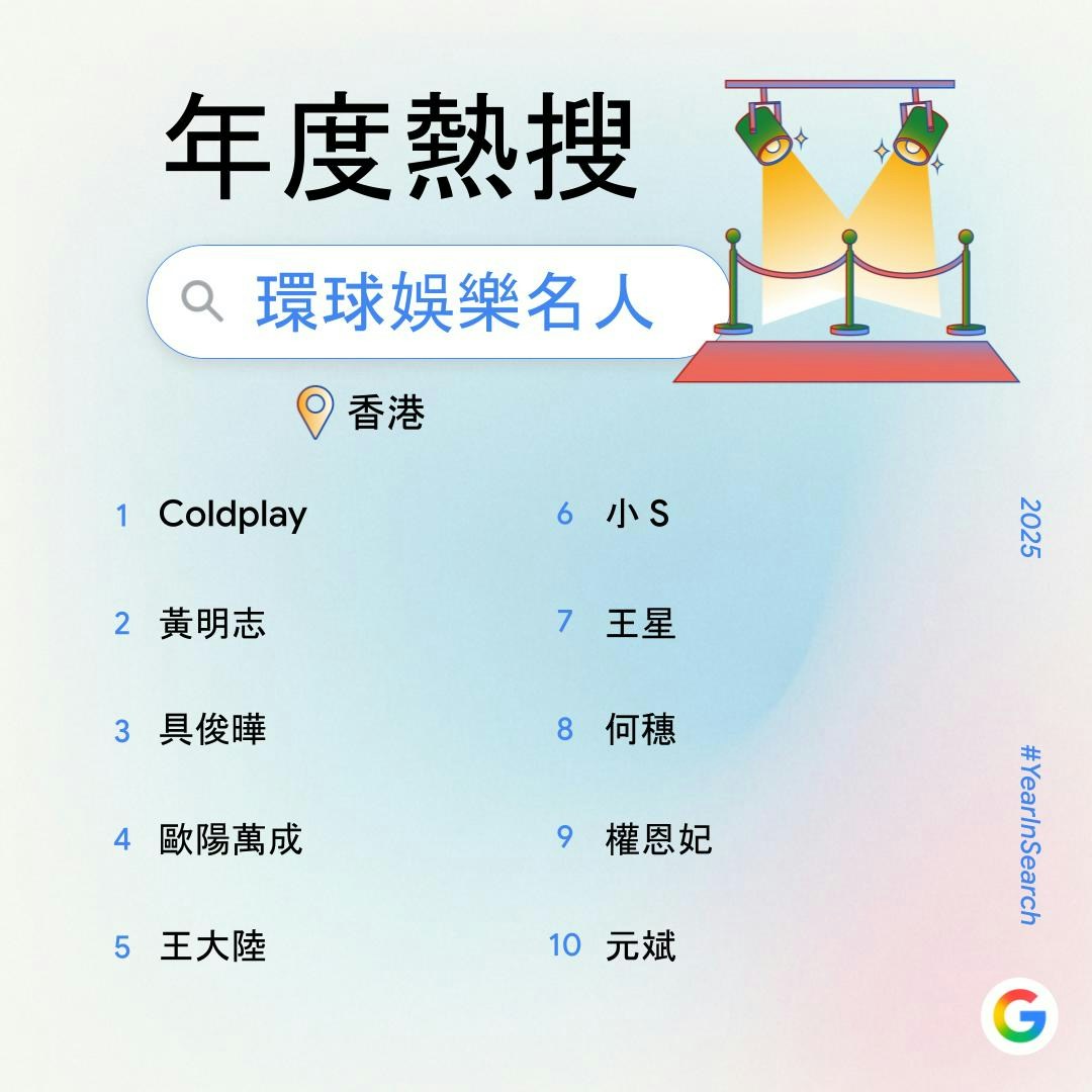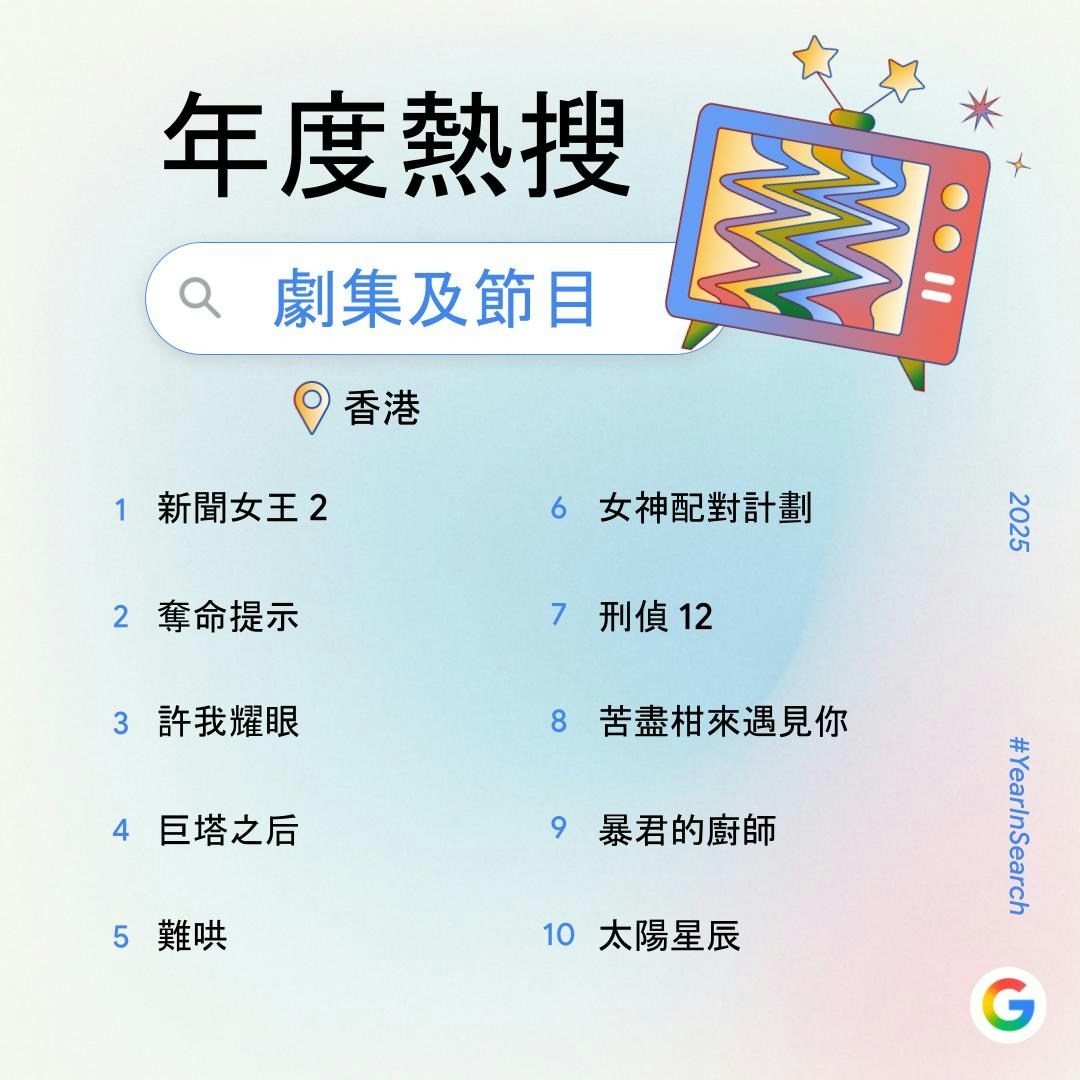 在「劇集及節目」方面,依然是無綫(TVB)的天下,榜單上有六套是在TVB播出,分別是《新聞女王2》、《奪命提示》、《巨塔之后》、《刑偵12》、《女神配對計劃》與《太陽星辰》,其中《女神配對計劃》是榜單中唯一的非劇集類節目。這類本土製作戀愛真人騷並不多,但早在外國已非常盛行兼極具話題性,觀眾不僅關注配對結果,更喜歡搜尋參加者的背景。今次證明了這類真人騷即使是木土製作,在香港亦有強大的流量,未知《女神配對計劃》的成功,會否為本土製作戀愛真人騷打下強心針?