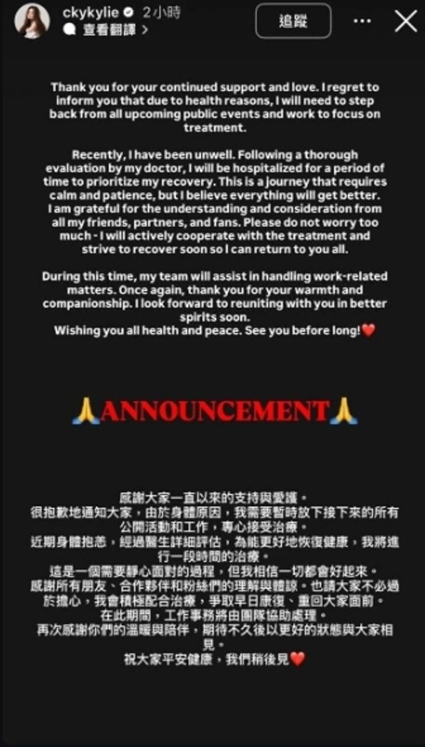 Kylie C. 在限時動態中以黑底白字寫下長文,語氣沉重。她表示:「很抱歉地通知大家,由於身體原因,我需要暫時放下接下來的所有公開活動和工作,專心接受治療。」她未有詳細透露病況,僅指經過醫生詳細評估,為了長遠健康著想,必須作出這個艱難決定。