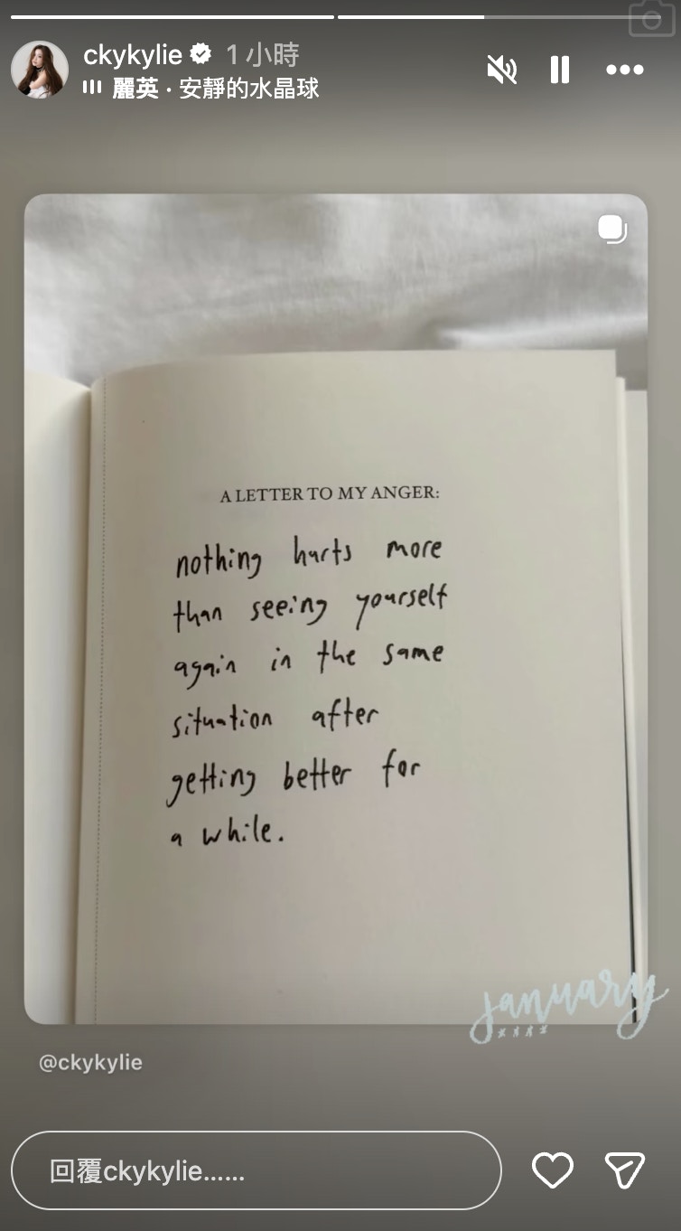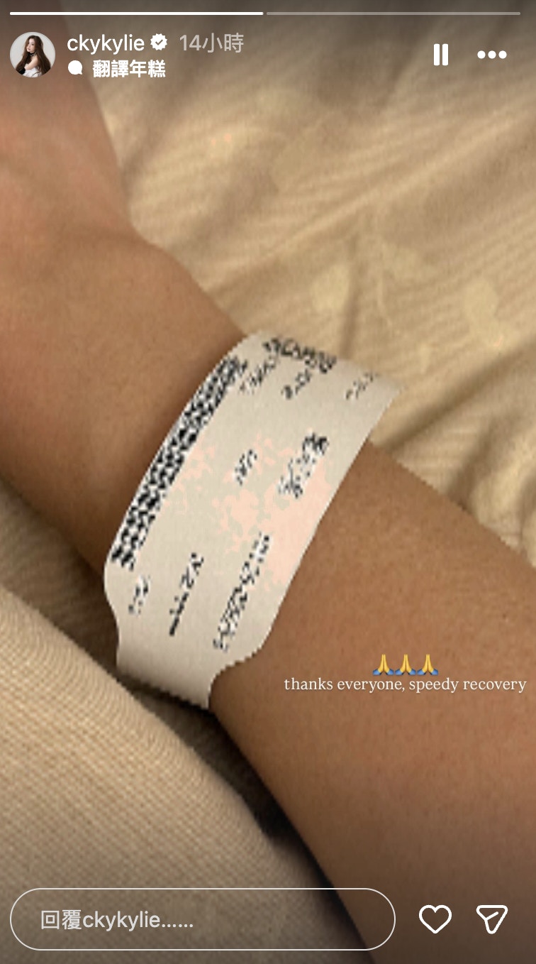Kylie C. 鄭杞瑤今日上載兩張圖片,其中一張顯示在醫院留院所佩帶的病人手帶,一旁寫着「thanks everyone, speedy recovery(多謝大家,我會盡量康復)」,另一張則是「A LETTER TO MY ANGER. nothing hurts more than seeing yourself again in the same situation after getting better for a while.(致憤怒:世上最痛心的,莫過於以為一切剛有好轉,轉眼卻發現自己又被打回原形,重陷困境。)」
