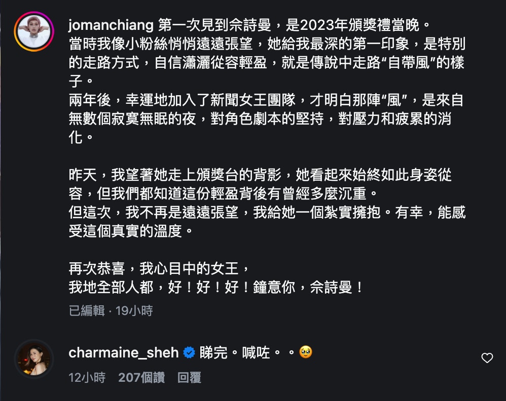 隨著兩年後幸運地加入《新聞女王》團隊,蔣祖曼終於有機會與阿佘近距離合作。她坦言,在真正接觸過後,才明白那陣「風」,是來自無數個寂寞無眠的夜晚,對角色劇本的堅持,以及對壓力和疲累的消化。蔣祖曼感性地寫道:「昨天(4日),我望著她走上頒獎台的背影,她看起來始終如此身姿從容,但我們都知道這份輕盈背後有曾經多麼沉重。」字裡行間流露出對阿佘滿滿的敬佩。