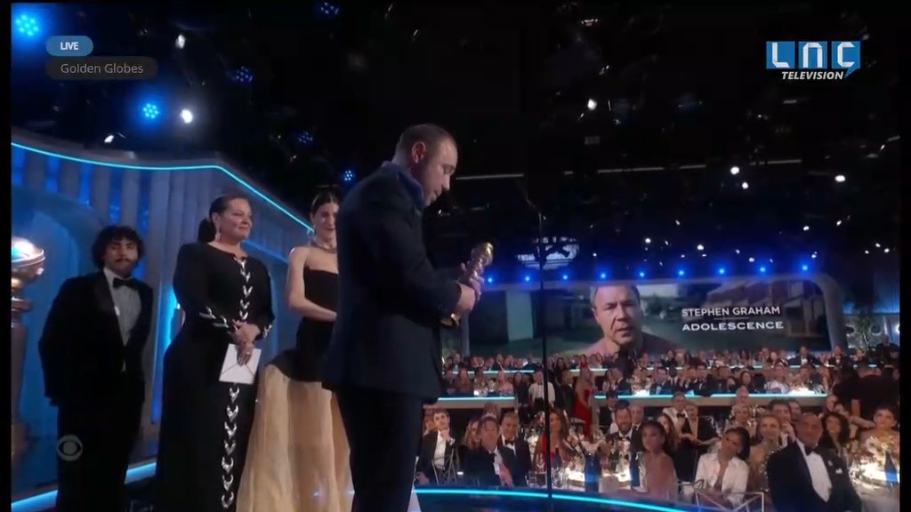 10:35 Stephen Graham憑《混沌少年時》奪得「最佳迷你劇集及電視電影男主角」獎,首次提名金球便獲封視帝!《混沌少年時》先後由Owen Cooper及Stephen Graham橫掃男配角及視帝兩大演技獎。