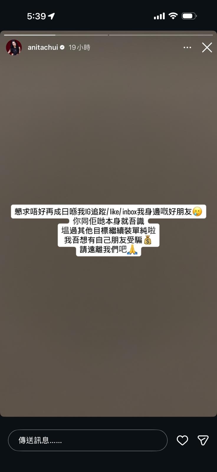 日前崔碧珈在IG限時動態火力全開,雖然未有直接點名,但內容明顯衝著近期與其傳緋聞的人而來。她懇求對方停止騷擾其身邊好友,更直指對方「裝單純」: