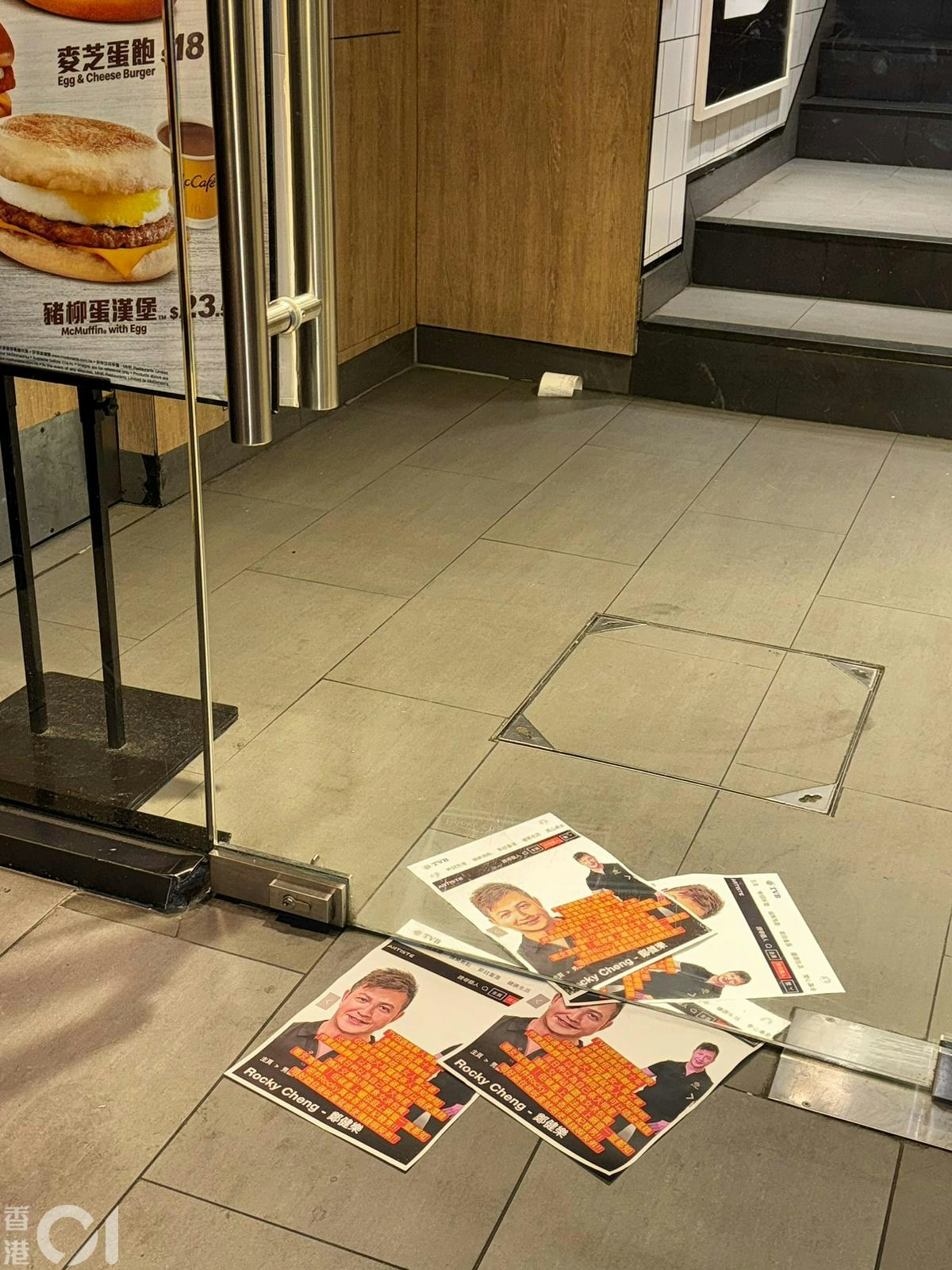 街招出現在快餐店地下及街道外牆等,用上Rocky在TVB的資料頁照片。(讀者提供)