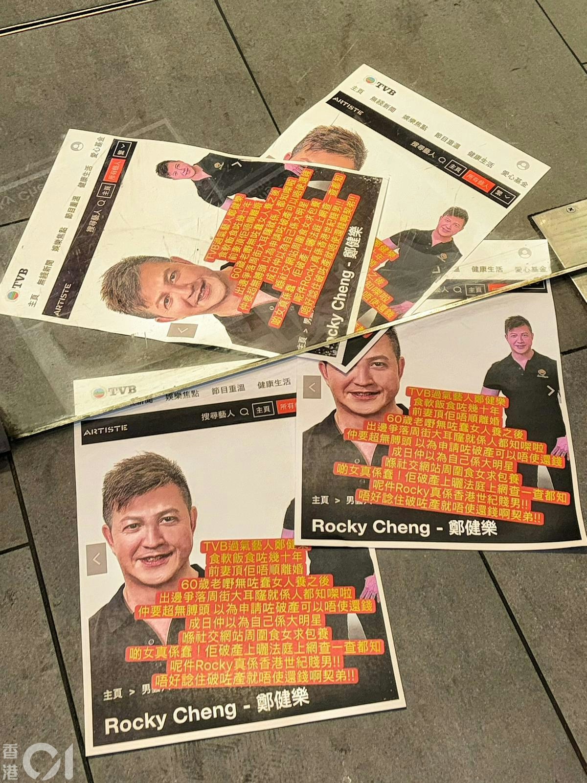 本來有部份網民同情Rocky,指他是「純愛戰士」遇上「玩家」,但近日有讀者向《01娛樂》爆料,指日前在旺角見到Rocky被貼街招,內容指控他幾宗罪及稱他欠債、破產等。街招出現在快餐店地下及街道外牆等,用上Rocky在TVB的資料頁照片,寫上:「TVB過氣藝人鄭健樂,食軟飯食咗幾十年,前妻頂佢唔順離婚,60歲老嘢無咗蠢女人養之後,出面爭落周街大耳窿就係人都知㗎超無膊頭,以為申請咗破產可以唔使還錢,成日仲以為自己係大明星,喺社交網站周圍食女求包養,啲女真係蠢!但破產上曬(晒)法庭上網查一查都知,呢件Rocky真係香港世紀賤男!! 唔好諗住破咗產就使還錢啊契弟!!」《01娛樂》聯絡Rocky查詢是否得罪人或被誣衊,至截稿前未有回覆。