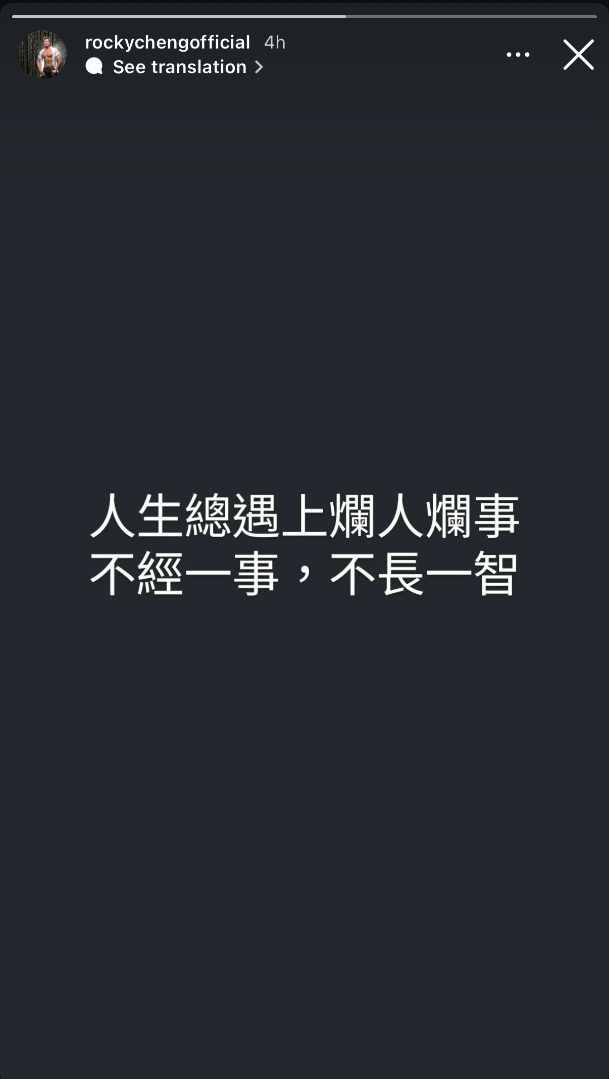 Rocky終於「蒲頭」,寫下佛家因果論,字裡行間似乎暗示自己才是受害者。(IG@ rockychengofficial)