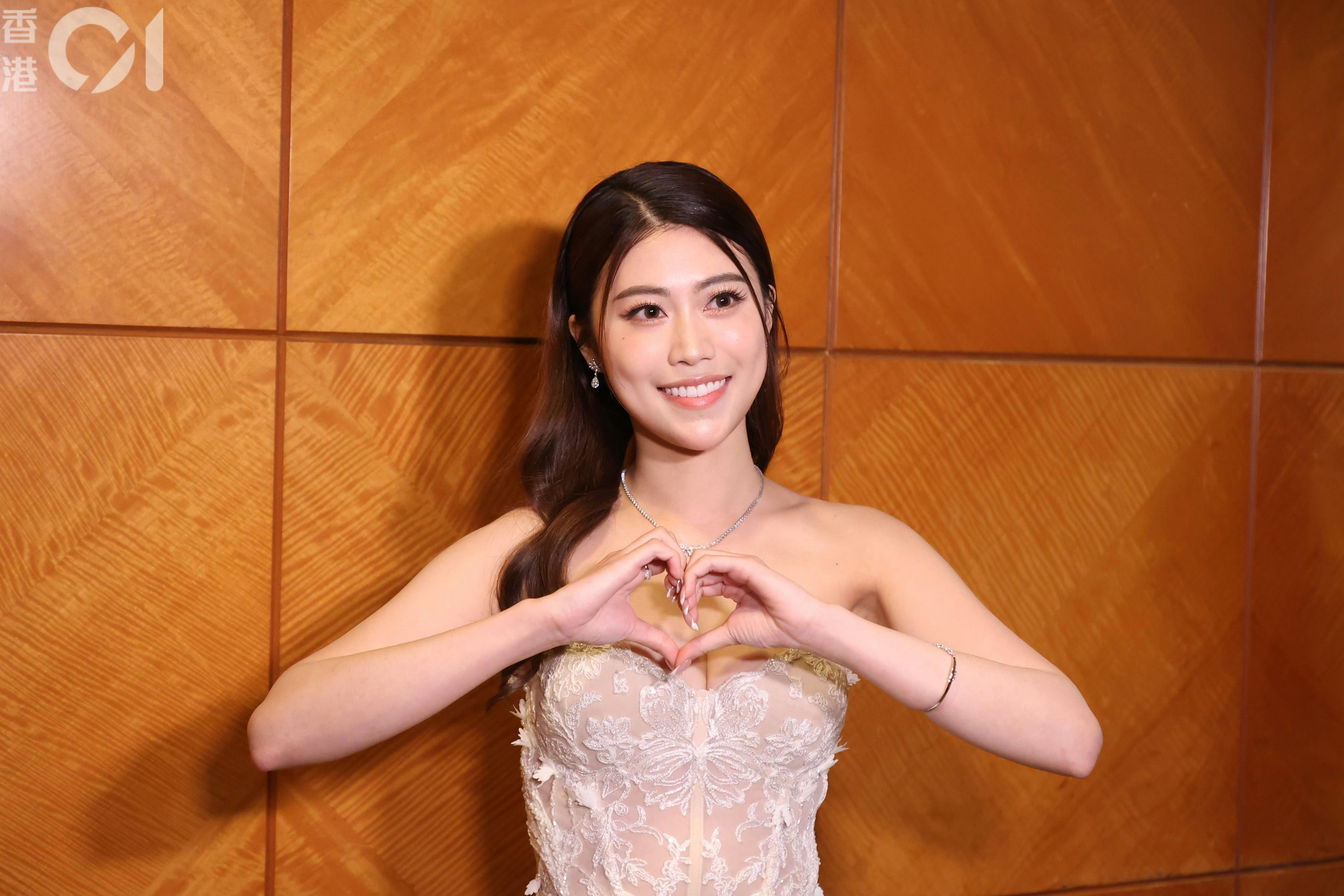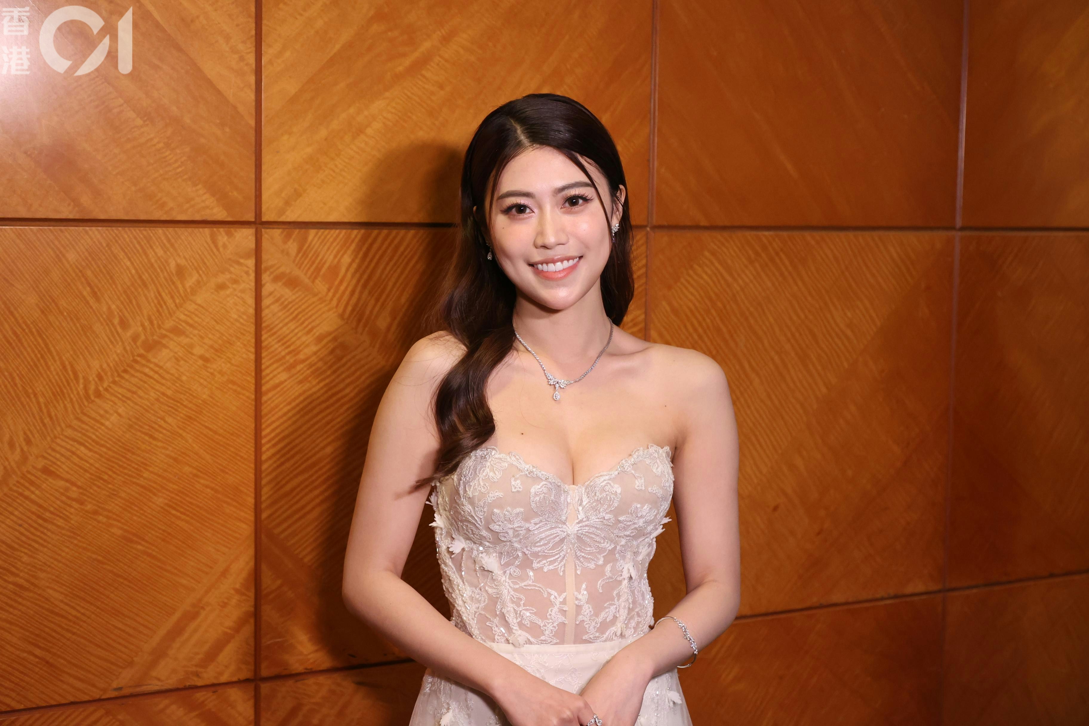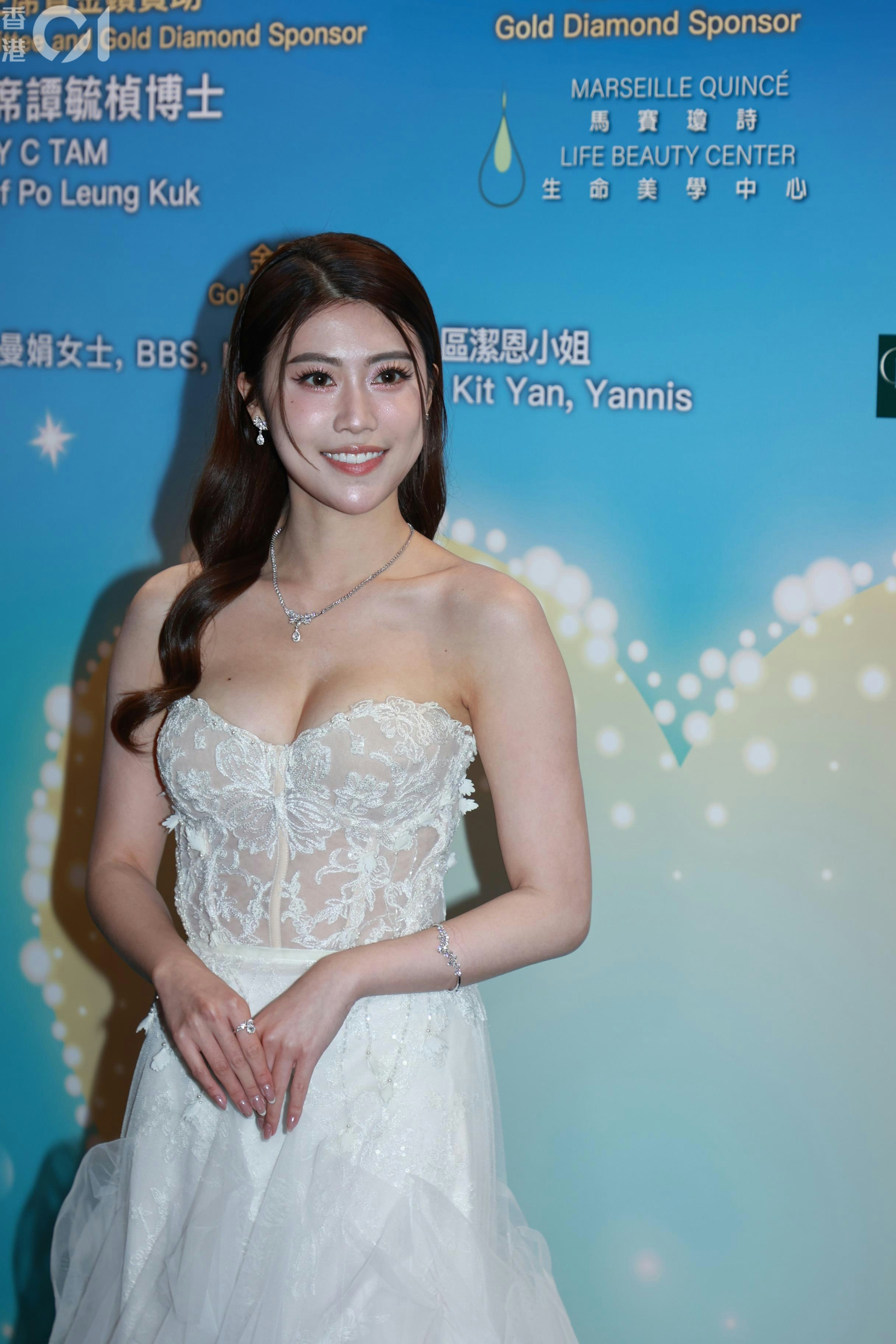 「我屋企人同朋友話呢條最襯我,所以就揀咗呢條。(邊條最性感?)唔⋯⋯有一條都幾性感,但係似我第一次參加台慶嗰條咁。(驚唔驚呢條太震撼?)你覺得呢?(而家睇唔到)哈哈,我肚腩大咗。」