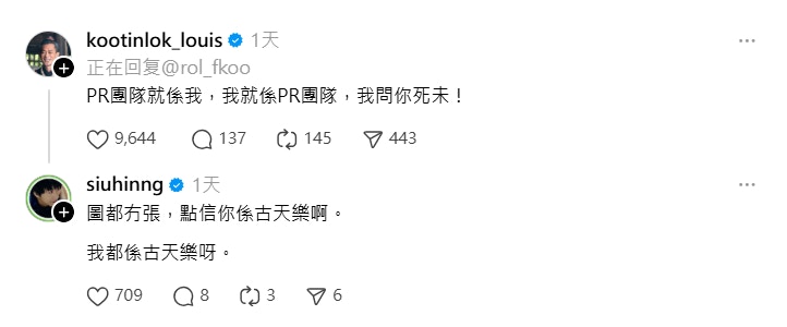 面對質疑,古天樂隨即展現幽默與霸氣,除了回覆留言說:「估到你哋唔信,好彩影低咗」,更親自拍片「上水」以正視聽。片中他身穿黑西裝錄製語音,更借用《明日戰記》的經典金句反擊:「PR團隊就係我,我就係PR團隊,我問你死未?!」