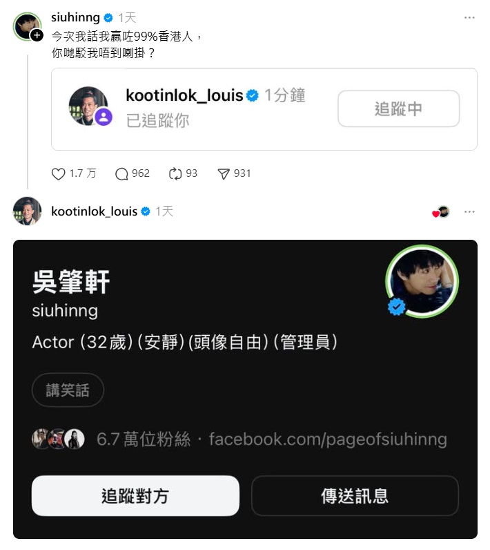 之後古天樂更反手追蹤了吳肇軒,令對方興奮大曬命:「今次我話我贏咗99%。香港人,你哋駁我唔到喇啩?」古仔亦搞笑回應(取消關注)並順道向大眾徵集第一條Post應寫甚麼。