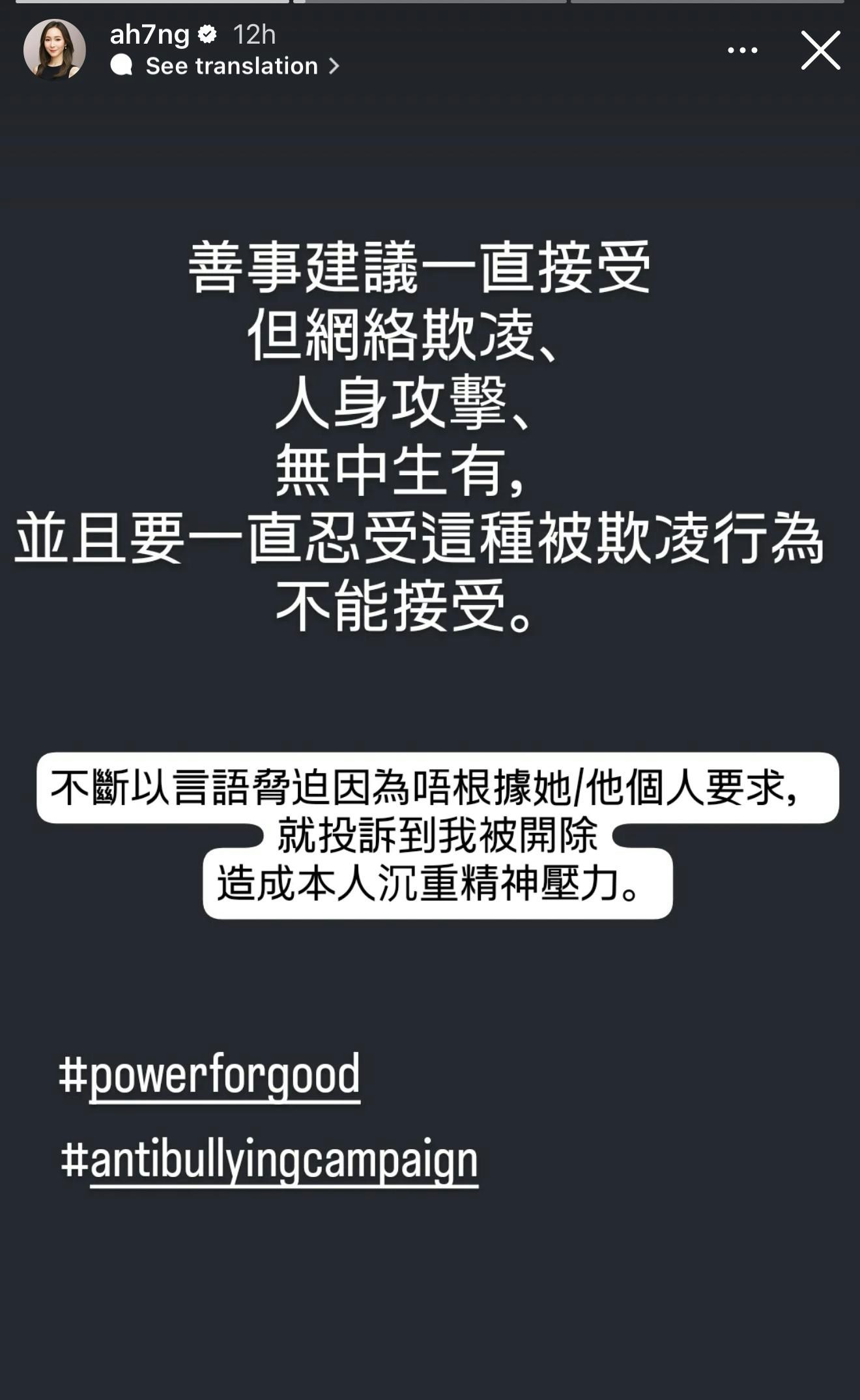 阿七透露有人長期人身攻擊、不實誹謗她,她提出四大指控,指被斥「醜人多八怪 已經去到場場人身攻擊」;又有人指斥她「話我自己掏銀包送禮物係唔公平」、「話我年紀大 年齡歧視」、「話我用加貨鼓令你隻耳有問題」。阿七呻:「不斷以言語脅迫因為唔根據她/他個人要求,就投訴到我被開除 造成本人沉重精神壓力。」阿七透露現時工作順利,只是想制止網絡欺凌,勸對方「回頭是岸」。