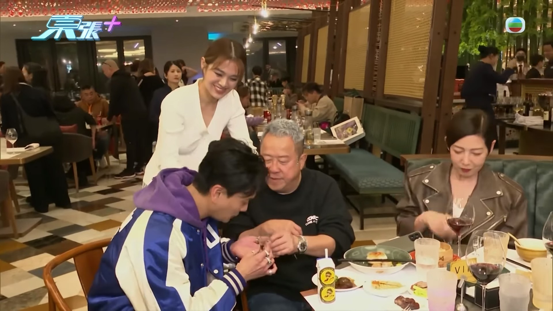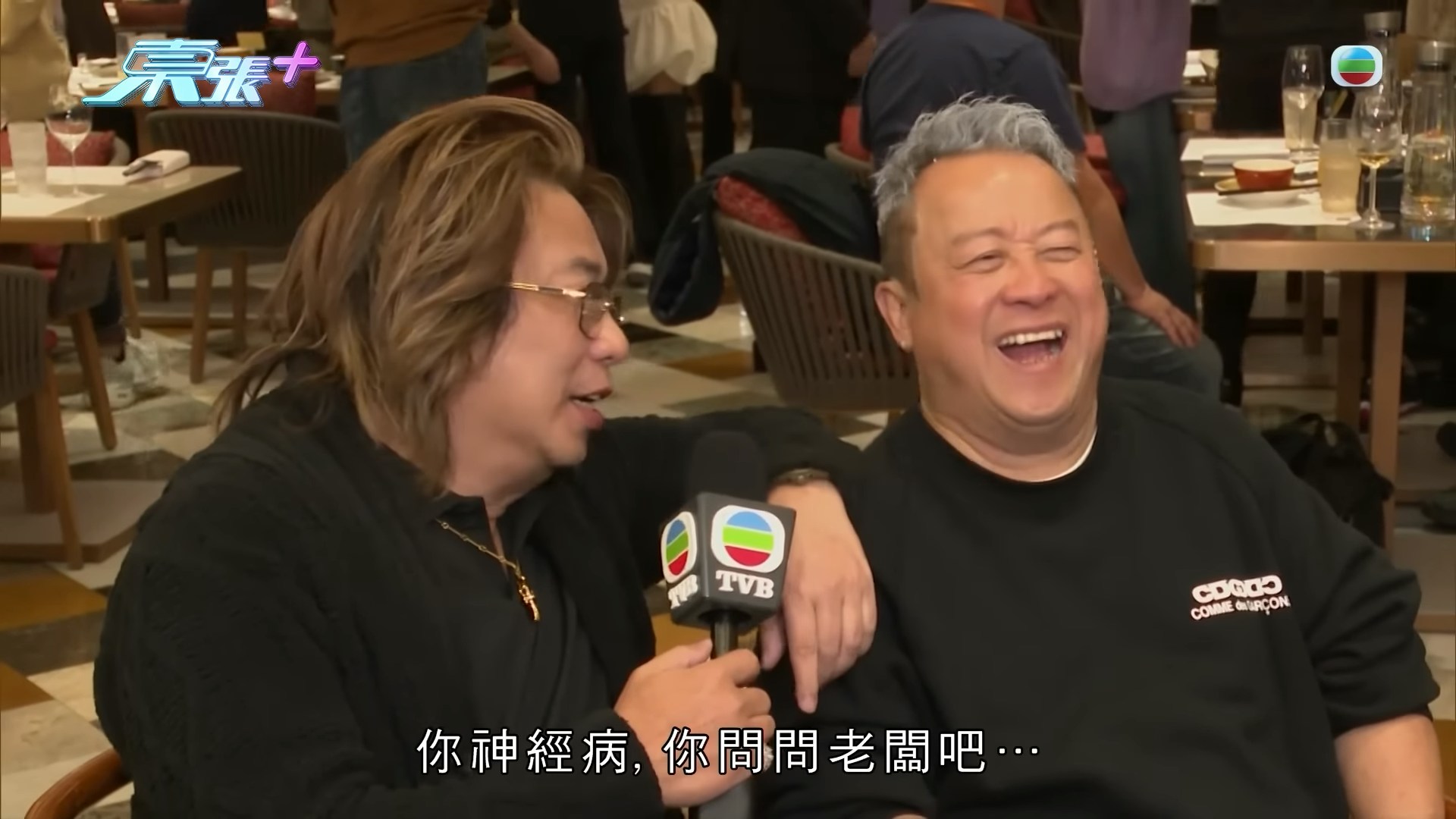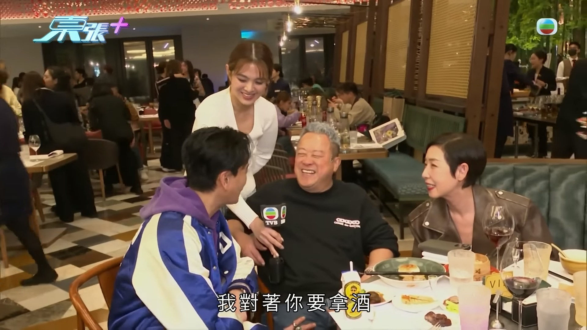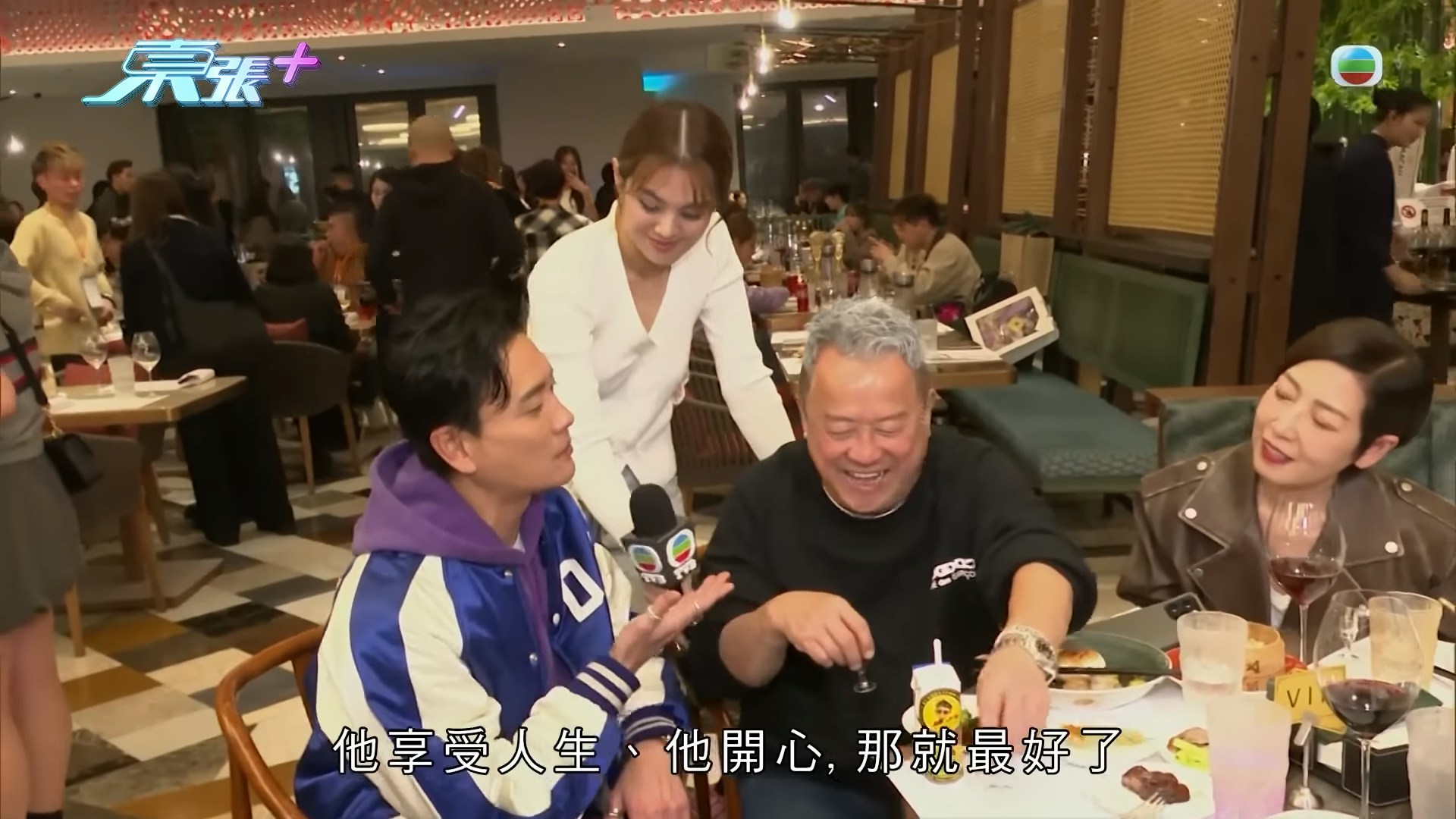 志偉聽罷大笑,隨即舉起酒杯與他碰杯,並恭喜對方勇奪雙料視帝殊榮,場面既溫馨又熱鬧。(YouTube@東張+)