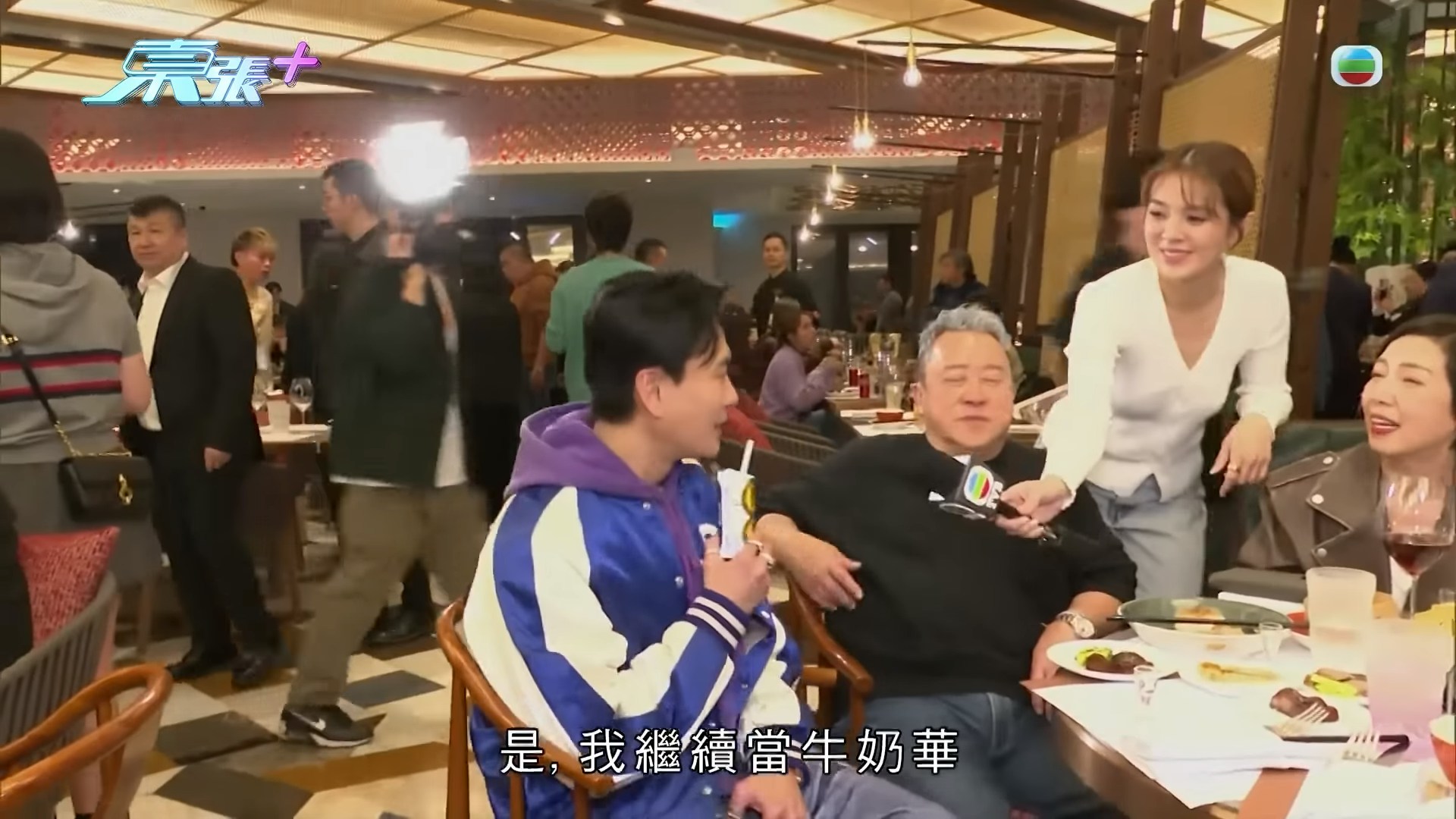 志偉見狀即笑問Bosco為何不拿著牛奶說話,Bosco則鬼馬地回應:「對住你唔可以拎牛奶,要拎住酒!」(YouTube@東張+)
