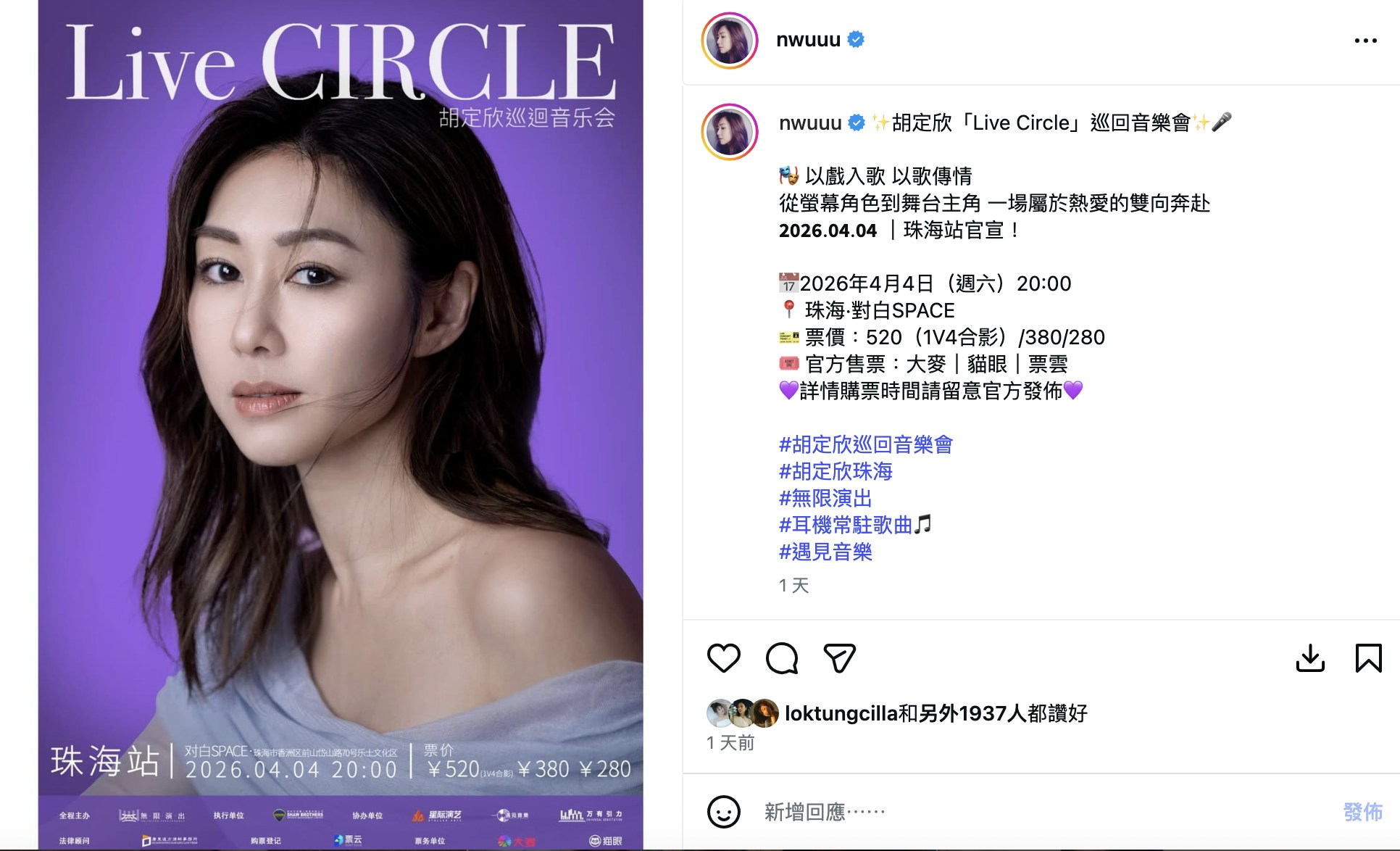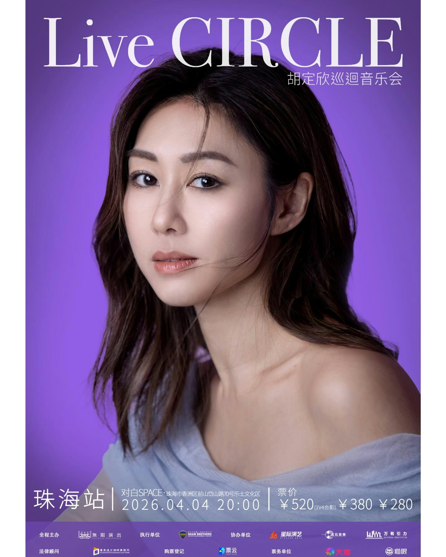 最近,胡定欣在社交平台為自己2026年4月4日的《胡定欣Live Circle巡迴音樂會》珠海站做宣傳,見到票價非常親民,分別為人民幣520/380/280,而買最貴飛520的觀眾,更可以有一張1V4合影。這個價錢可以近距離觀看偶像演出,又可以與偶像合照,對粉絲來說絕對值回票價。
