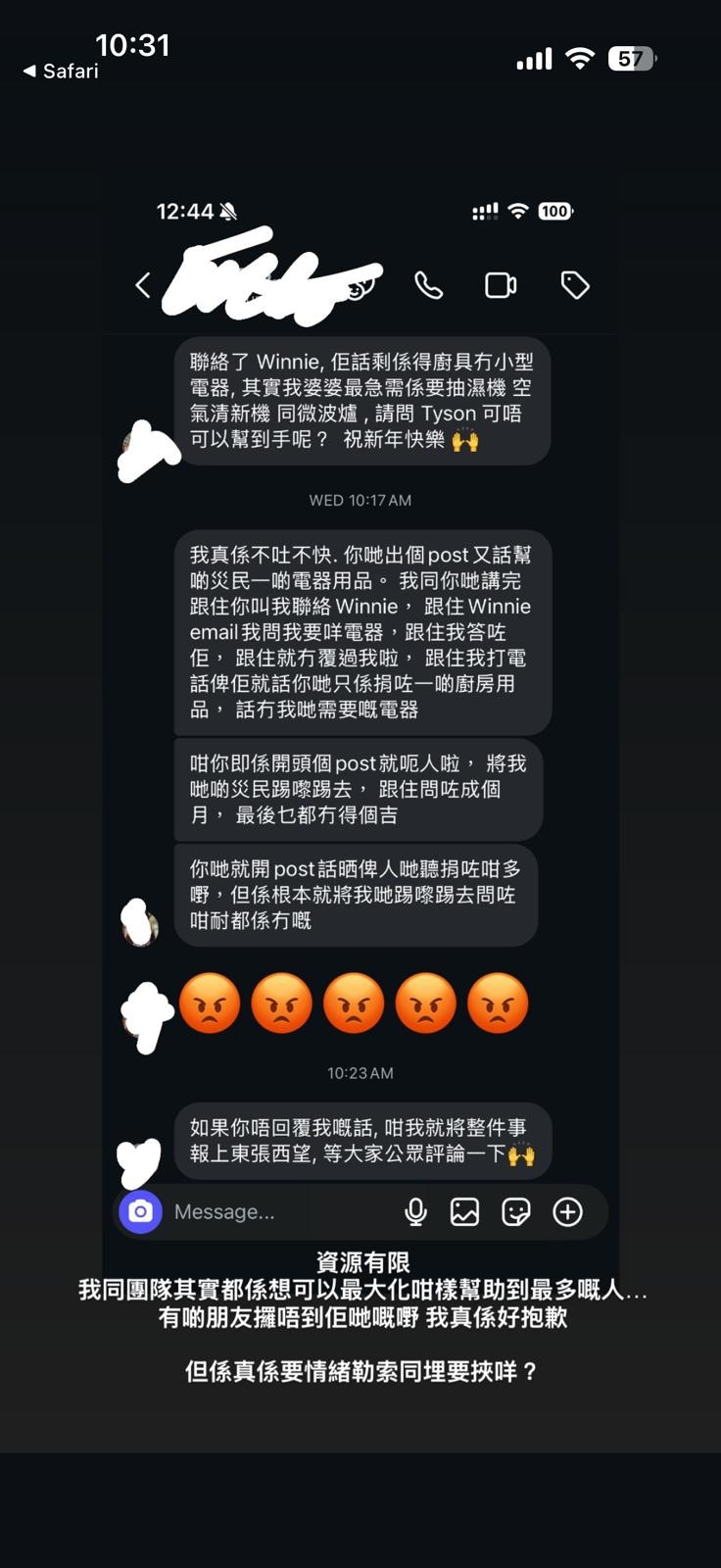 從截圖中可見,有網民私訊表示:「聯絡了Winnie,佢話剩係得廚具冇小型電器,其實我婆婆最急需係要抽濕機、空氣清新機同微波爐,請問Tyson可唔可以幫到手呢? 祝新年快樂。」之後該網民就抱怨說:「我真係不吐不快,你哋出個post又話幫啲災民一啲電器用品。我同你哋講完跟住你叫我聯絡Winnie,跟住Winnie email我問我要咩電器,跟住我答咗佢,跟住就冇覆過我啦,跟住我打電話俾佢就話你哋只係捐咗一啲廚房用品,話冇我哋需要嘅電器。」還狠批Tyson Yoshi道:「咁你即係開頭個post就呃人啦,將我哋啲災民踢嚟踢去,跟住問咗成個月,最後乜都冇得個吉。」、「你哋就開post話捐咗咁多嘢,但係根本就將我哋踢嚟踢去問咗咁耐都係冇嘅。」甚至威脅要公開事件讓大家公審:「咁我就將整件事報上《東張西望》,等大家公眾評論一下。」