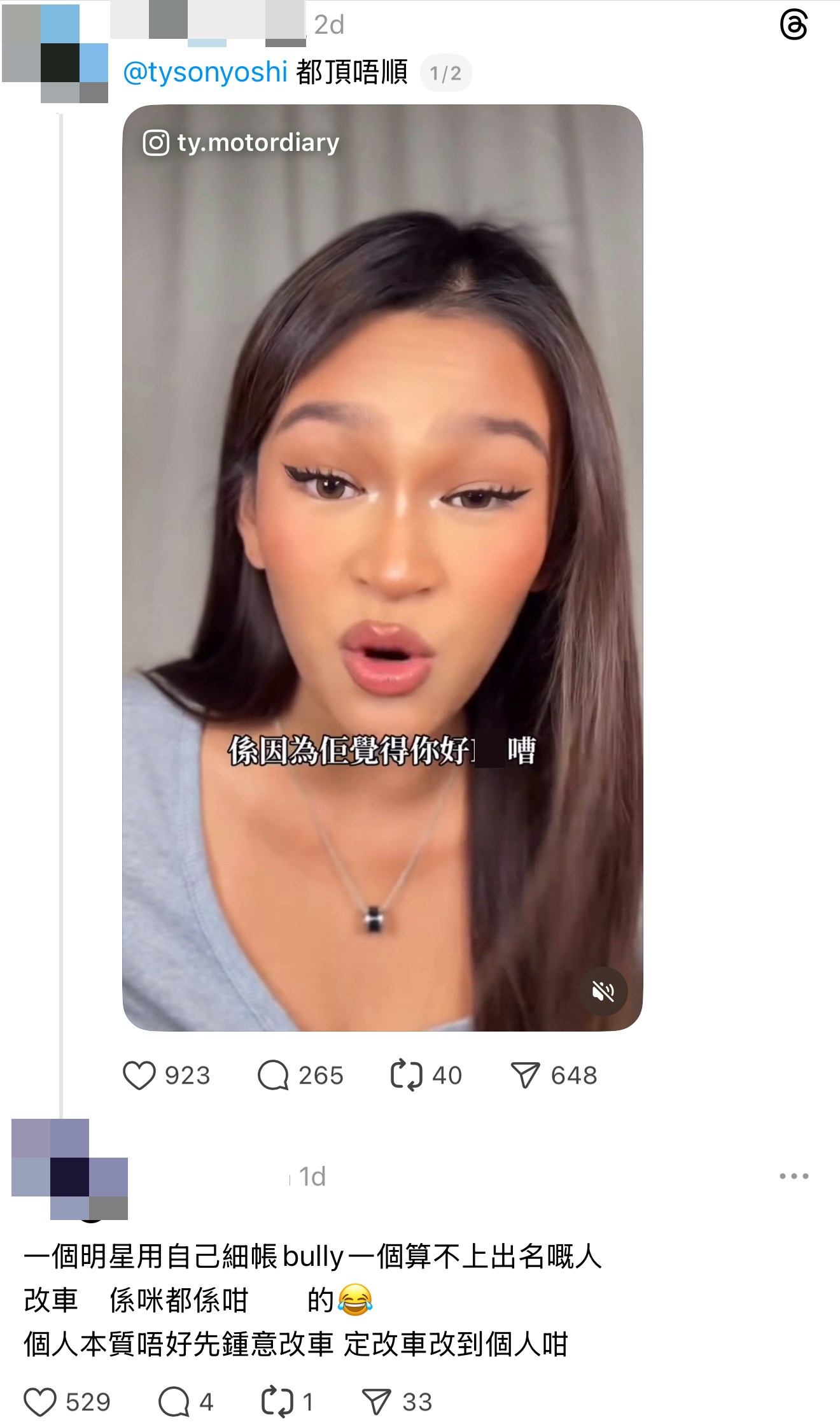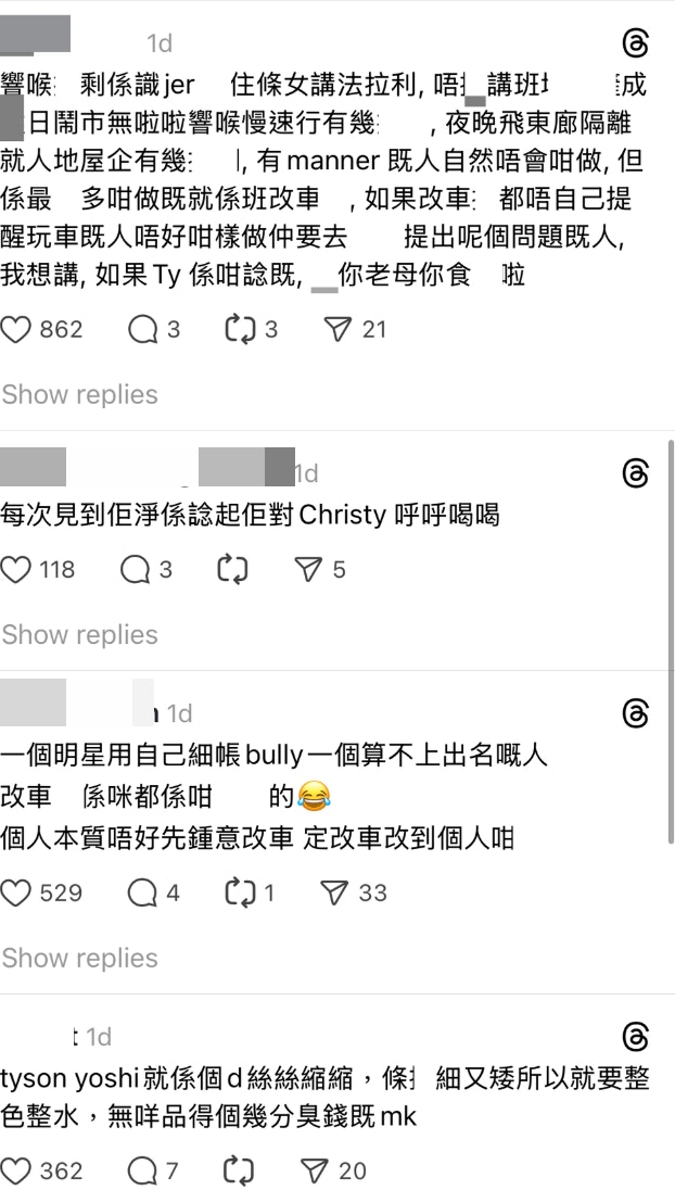 歌手Tyson Yoshi(程浚彥)不時因敢言出位,近日因「響喉」問題再度引起熱議!事源在Instagram坐擁67.5K追蹤者的KOL「Hera Chung」,日前拍片控訴有人改裝車輛造成噪音滋擾。她直言:「你要飛車 I don't give a fxxk but stop making noise. 乖啦,如果你想型嘅話儲錢買架超跑啦,你喺Toyota度加兩條管,冇人覺得你型㗎!」