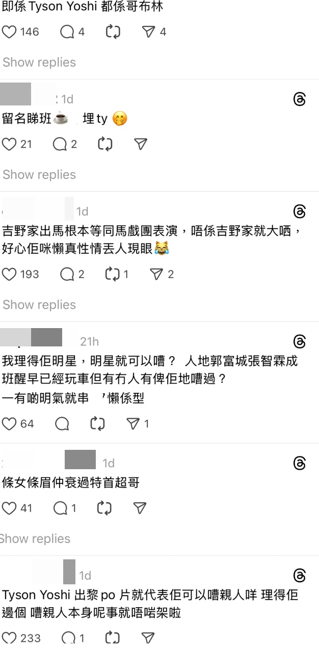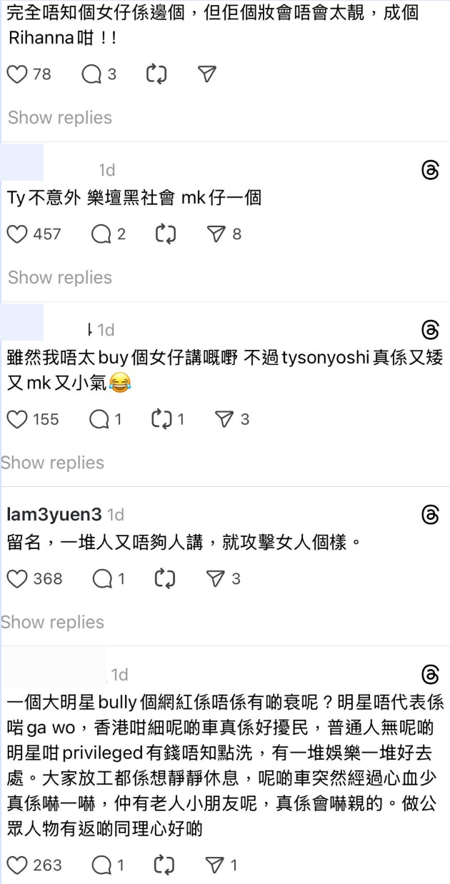 有網民指Tyson Yoshi「跟得好貼」,亦有人不認同Tyson Yoshi的做法,直斥車輛「響喉」確實對他人造成滋擾;又指身為有影響力公眾人物的Tyson Yoshi此舉不當,有帶頭欺凌該KOL之嫌。