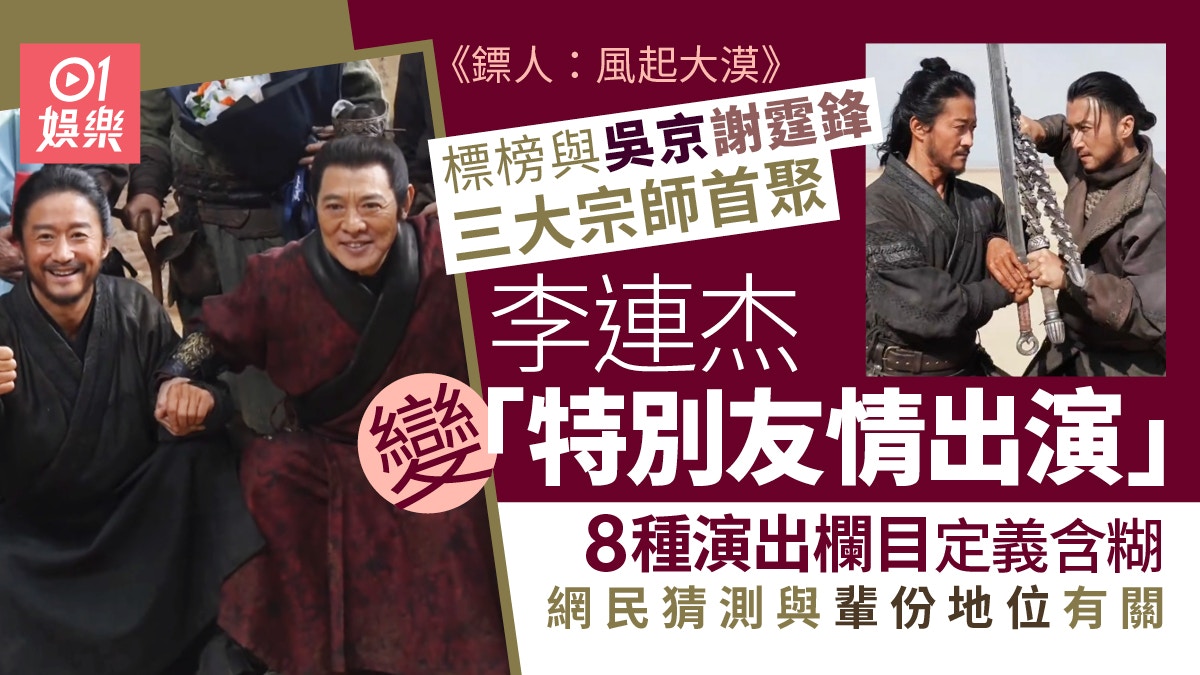 國際武打巨星「功夫皇帝」李連杰多年未有主演新戲,目前最後一部主演作品《鏢人:風起大漠》由袁和平執導,與吳京、謝霆鋒合作主演,日前電影推出預告片段並宣布將於內地賀歲新春檔期上映,讓影迷觀眾極為期待!《鏢人:風起大漠》推出預告片後,觀眾除討論李連杰、吳京與謝霆鋒上演的精彩動作場面外,亦被片末兩頁演員名單所吸引,當中曝光梁家輝、張晉與惠英紅等有份參演外,觀眾對多達八項「主演」形式感到疑惑,旋即引起網民在內地社交媒體討論。